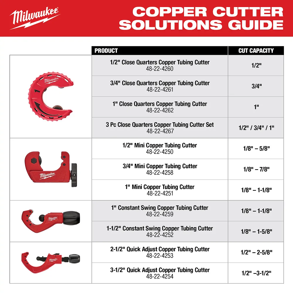 The Milwaukee® 1/2 in. mini copper tubing cutter is designed to be the most durable mini cutter on the market. Featuring a proprietary adjustment mechanism, Milwaukee mini tubing cutters are engineered for 5X longer life. For added durability and extended performance, chrome rollers provide best in class rust protection. An easy grip knob allows faster adjustment and easier use.