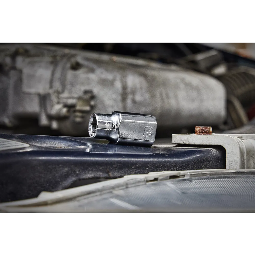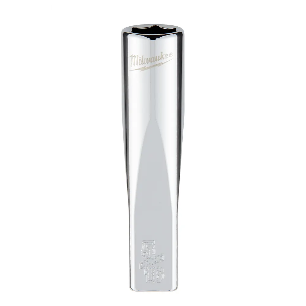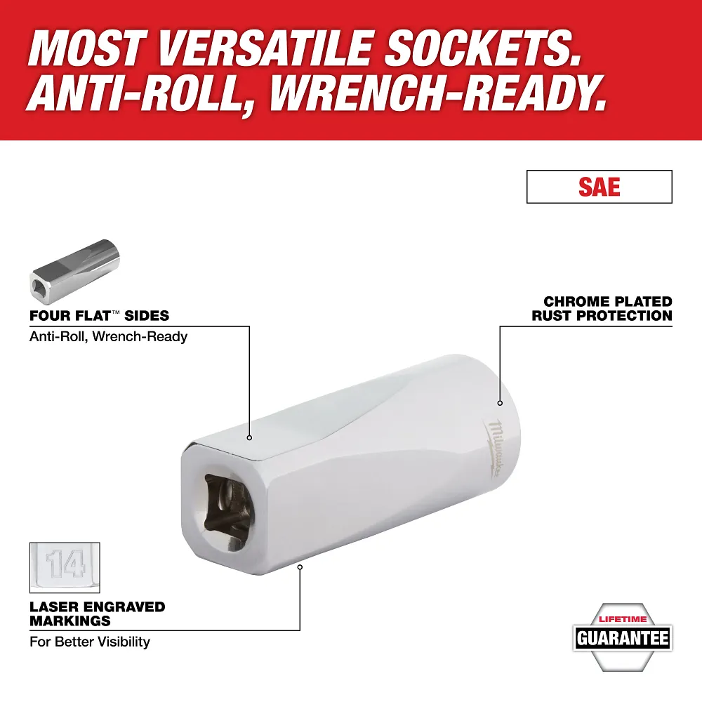 The MILWAUKEE® 1/4″ Drive 5/16″ SAE 6-Point Deep Socket with FOUR FLAT™ Sides was designed from the ground up to be part of the most versatile socket family. The 1/4″ drive sockets are wrench-ready and feature an innovative design with four parallel flat sides to deter rolling. SAE socket sizes are stamped into the flats for better visibility. Optimized deep well socket geometry helps reduce bolt rounding and stripping.
