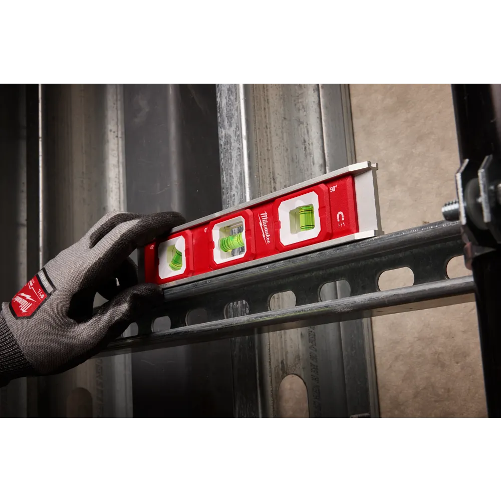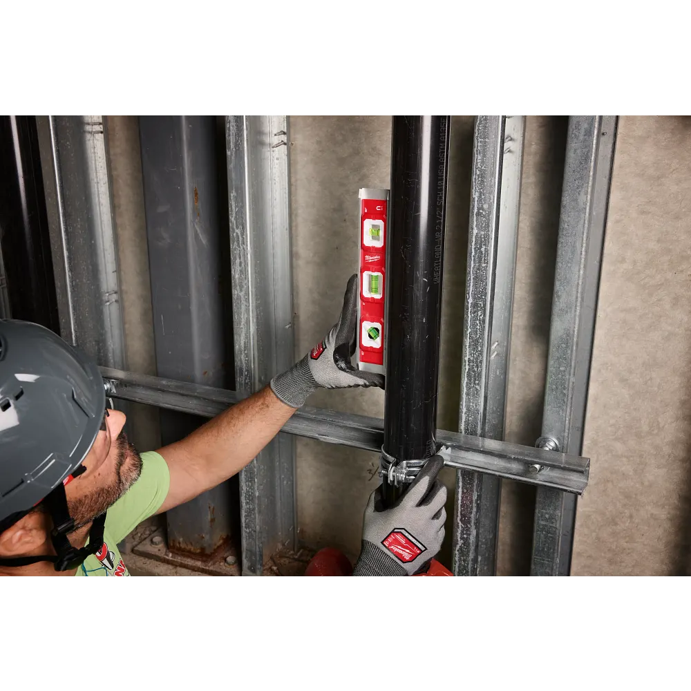 The MILWAUKEE® 10” Torpedo Level has high contrast surrounds, which deliver more vial visibility when leveling surfaces or setting pitch in pipe. The level also has a durable aluminum frame helping protect it from drops and harsh jobsite conditions. The 3 rare earth magnets and V-grooves make working with conduit and metal material easier. The level has 3 vials to accurately measure 0°, 45°, and 90° when leveling surfaces such as trim, shelving, windows, and outlets. The Milwaukee® 10” Torpedo Level is backed by a Limited Lifetime Warranty.