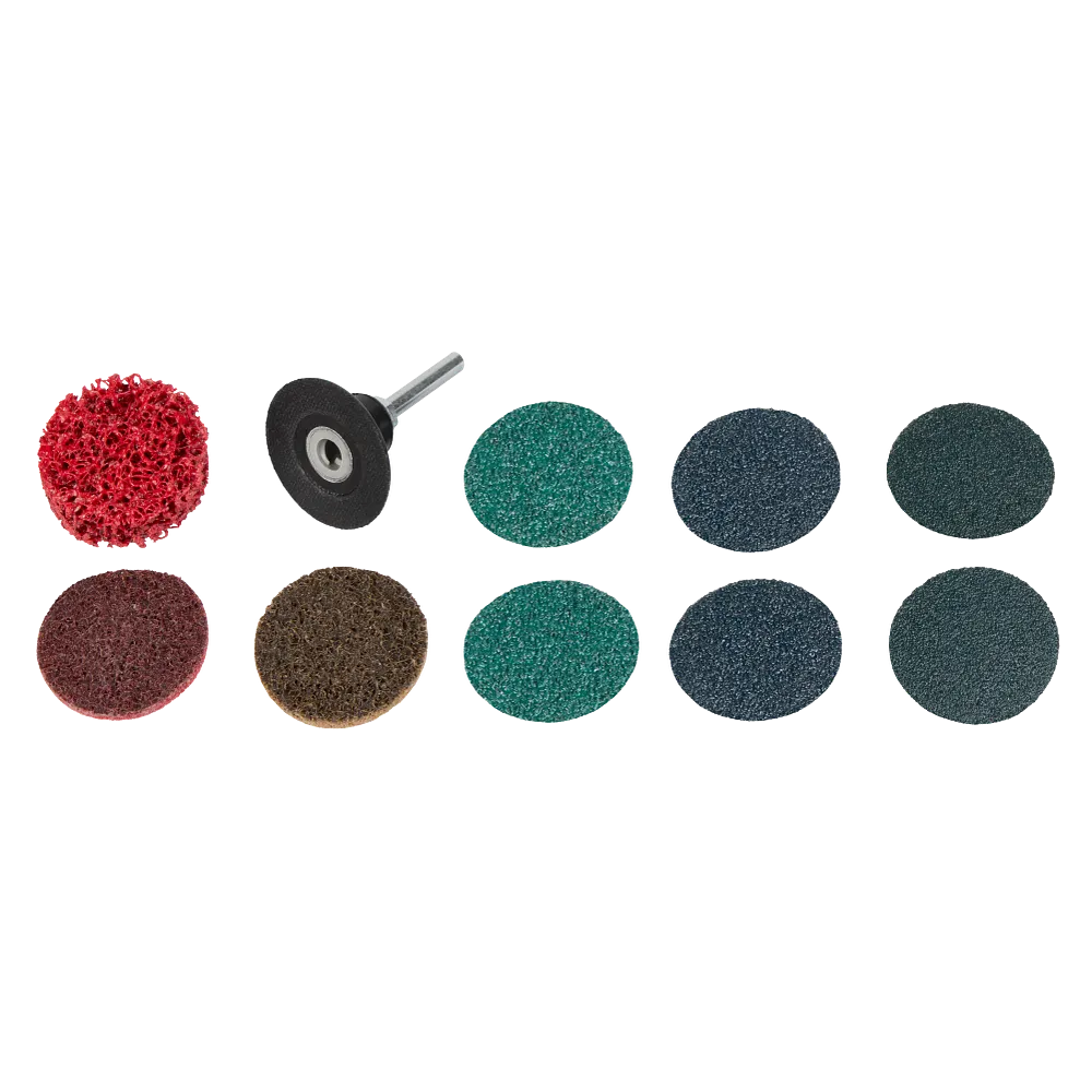• Kit includes: (2) 24 Grit Sanding Discs, (2) 36 Grit Sanding Discs, (2) 50 Grit Sanding Discs, (1) Medium Grade Surface Conditioning Disc, (1) Course Grade Surface Conditioning Disc, (1) Paint Removal Disc, (1) Universal ¼” Arbor w/ Quick Change Backer Pad