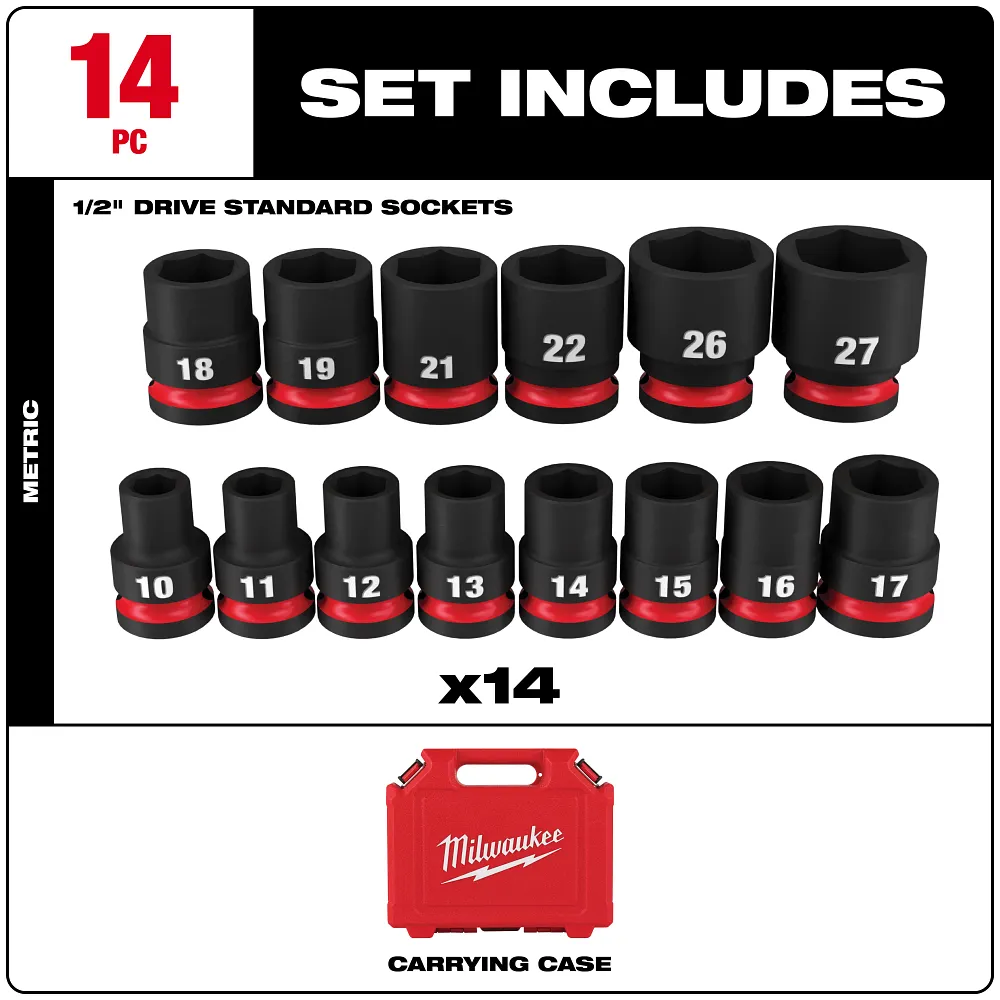 The MILWAUKEE® 14-Piece SHOCKWAVE Impact Duty™ 1/2 in. Drive Metric Standard 6 Point Socket Set features the boldest, longest-lasting markings and extreme impact durability in high torque applications. The stamped and ink-filled size marking makes selecting the right socket every time easy throughout the life of the socket. These Milwaukee sockets are engineered with high strength forged steel for optimized performance in heavy-duty applications. The non-slip hex geometry prevents fastener rounding, and a dual-hole design and ring groove allow for easy socket attachment and removal. The storage cases are impact resistant and nest together for easy stacking and storage. All SHOCKWAVE Impact Duty™ Sockets backed by a Lifetime Guarantee and meet ASME industry standards.