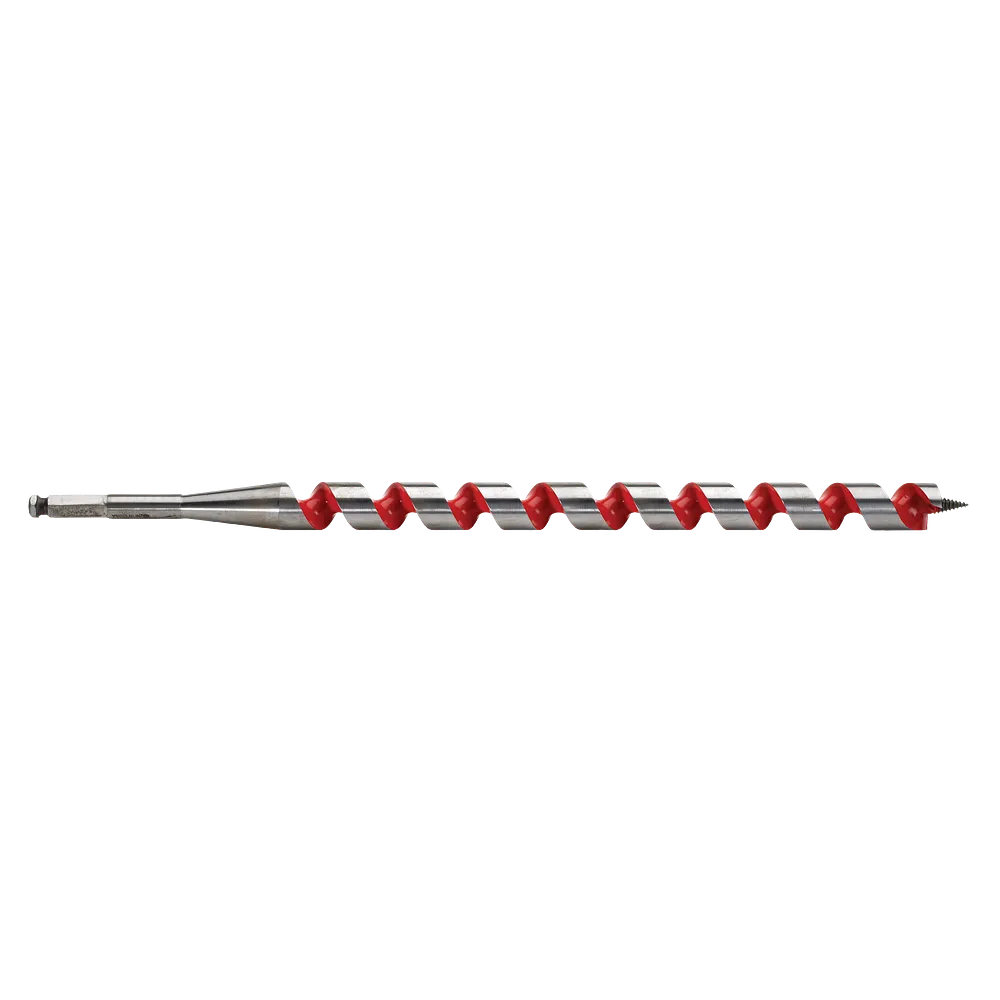 The Milwaukee® 15/16 in. x 18 in. Ship auger bit drills through up to 2X the nails of competitive auger bits without needing resharpening. Drill into clean or nail-embedded wood with confidence when installing Romex wire, PEX water lines, rebar, bolts, and rope in piers, playground equipment and landscaping. The flutes are wider for maximum chip removal, even in deep holes. The polished and coated flute finish means chips won’t stick to the bit, even when drilling in material that contains sap or glue. The through-center cutting design creates a more solid striking point against nails compared to the competitions’ ahead-of-center and behind-center designs. The longer shaft length makes it easy to drill deeper or overhead without an extension.