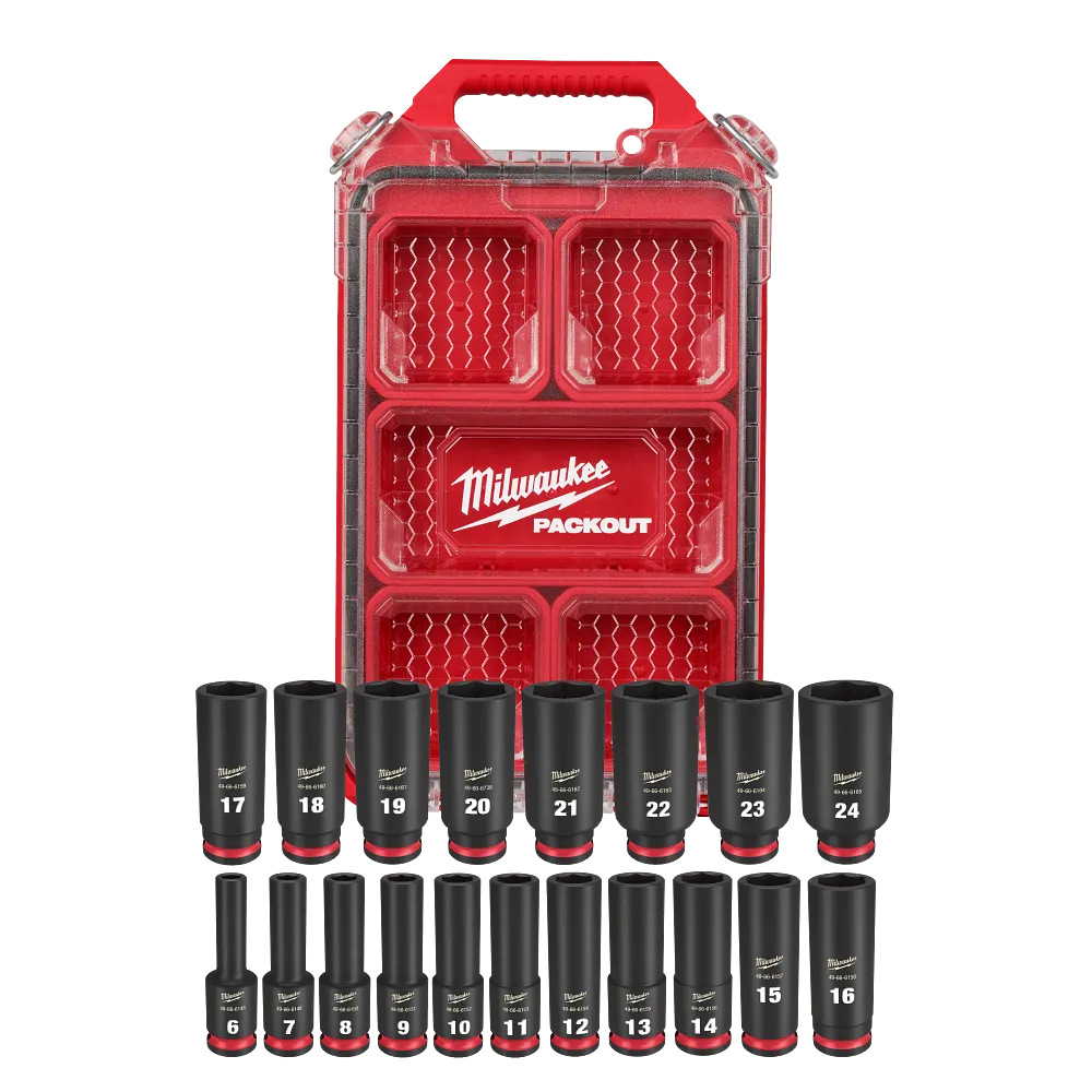 MILWAUKEE® Impact Duty™ Socket Set features the boldest, longest-lasting markings and extreme impact durability in high torque applications. The stamped and ink-filled size marking enables you to select the right socket every time throughout the life of the socket. Engineered with high-strength forged steel for optimized performance in heavy-duty applications. The non-slip hex geometry prevents fastener rounding. The Milwaukeee dual-hole design and ring groove allow for easy socket attachment and removal. Sets can be kept organized in the included MILWAUKEE® PACKOUT™ Compact Low-Profile Organizer with a clear top for easy identification of parts at a glance. The Low-Profile Organizer is part of the MILWAUKEE® PACKOUT Modular Storage System, allowing for customization of storage systems to easily transport and organize tools and accessories. All Milwaukee SHOCKWAVE Impact Duty ™ Sockets and Extensions are backed by Milwaukee’s Lifetime Guarantee and meet ASME industry standards.
