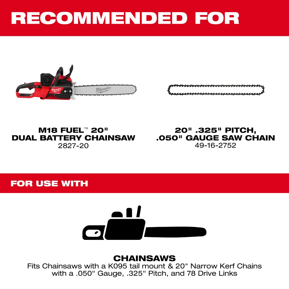 • Recommended for use with M18 FUEL™ 20″ Dual Battery Chainsaw (2827-22) and 20″ .325″ Pitch, .050″ Gauge Saw Chain (49-16-2752)