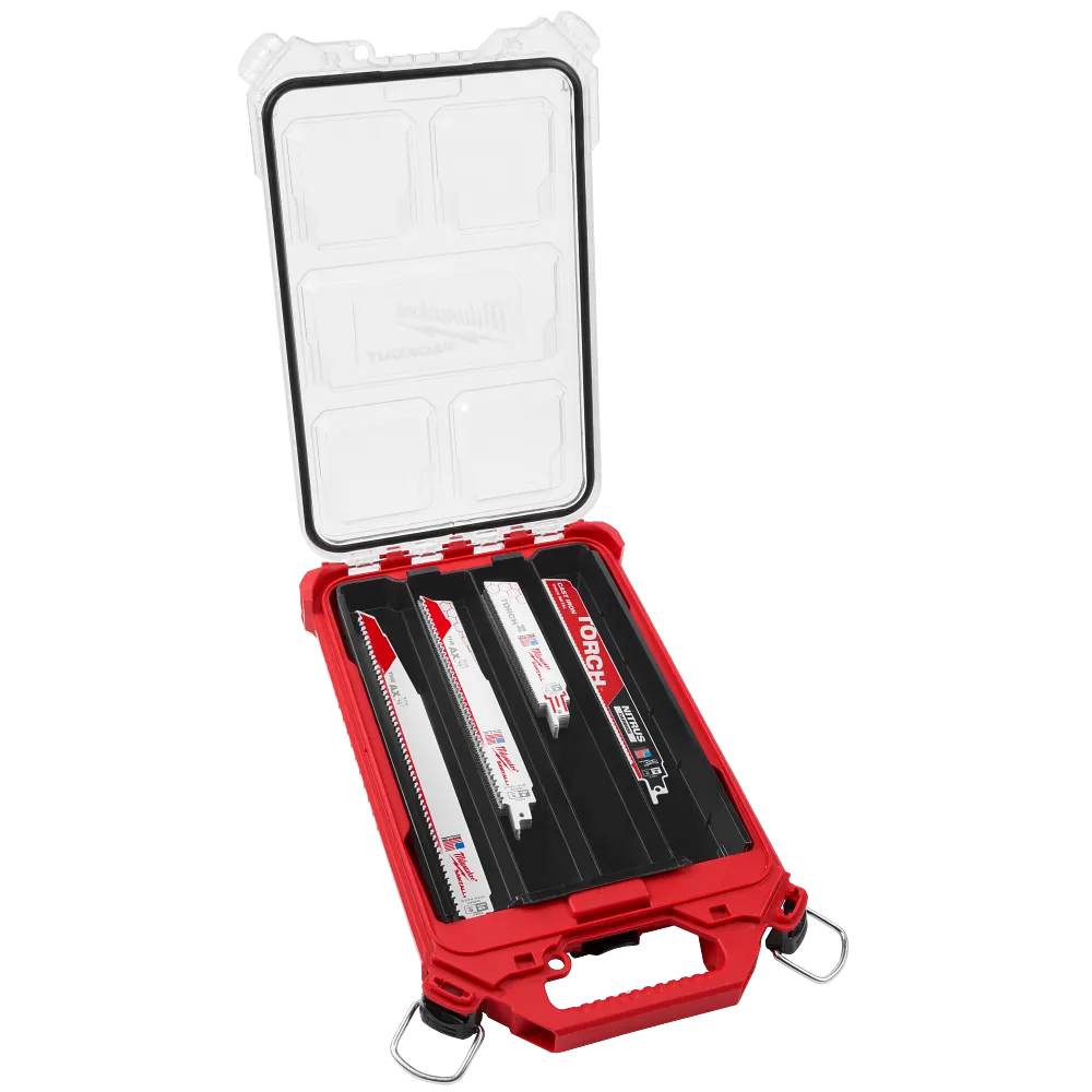 The MILWAUKEE® 22PC SAWZALL® Blade Kit with PACKOUT™ Low Profile Compact Organizer includes a removable storage tray with the capacity to store up to 12” long SAWZALL® blades. This kit features (22) SAWZALL® blades. This kit includes the TORCH w/ NITRUS™ Carbide for Cast Iron Blade and is designed for the toughest cast removals. NITRUS™ delivers the fastest-cutting, longest-life products with breakthrough carbide technology. The TORCH™ Blades for metal applications feature TOUGH NECK™ ribs that strengthen your blade’s tang and minimize breakage. The AX™ Blades for wood applications feature NAIL GUARD™ to protect your blade’s teeth from fracturing during cutting while the FANG TIP™ feature allows you to easily perform plunge cuts. The reciprocating saw blades in this set are ideal for a variety of metal and wood applications.