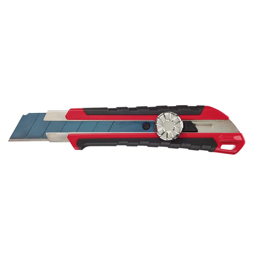 The Milwaukee® 25mm snap-off knife has a new to world all metal lock designed for maximum durability that will hold up to 10x longer. The lock comes with a speed thread that allows for 2x faster blade adjustments. This snap-off knife comes with a 7-point detail-cut, micro Carbide blade and will last up to 2x longer, and up to 50% sharper. The overmolded handle offers a slip resistant grip and is acetone resistant and is backed by Milwaukee’s Limited Lifetime Warranty.