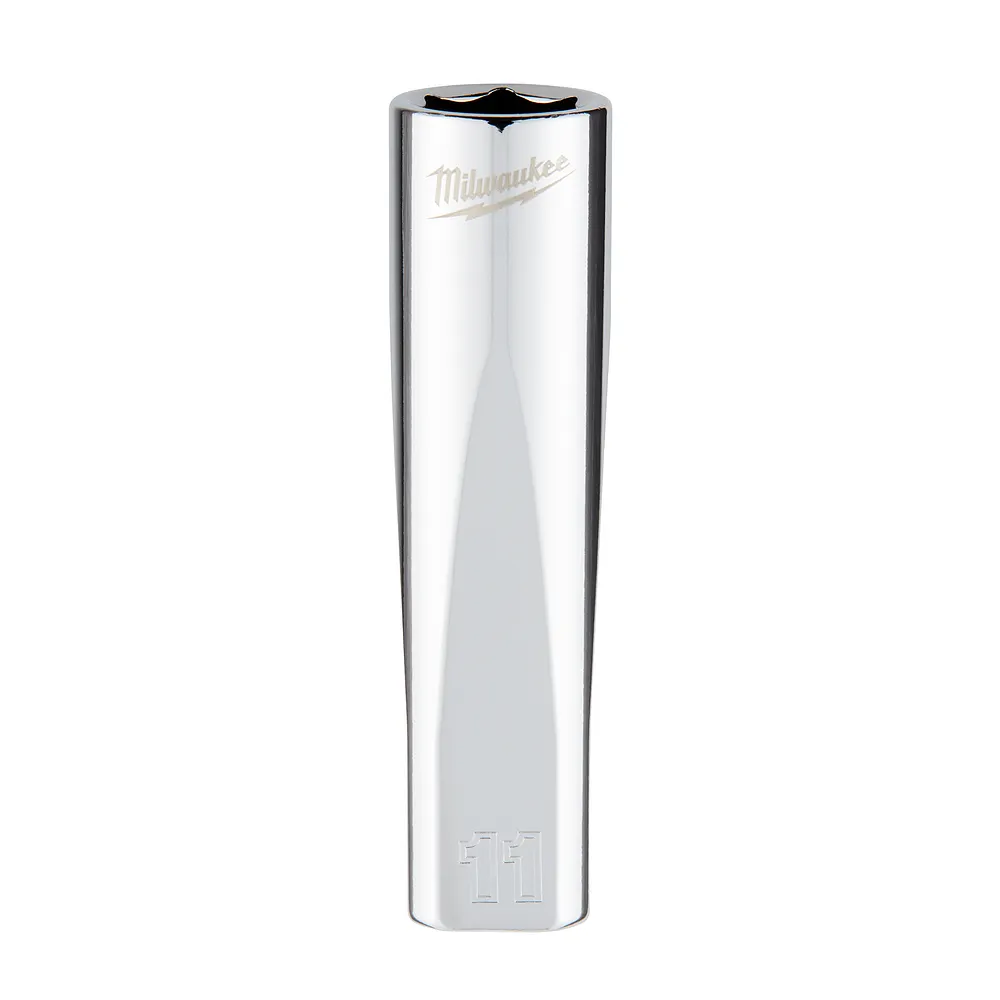 The MILWAUKEE® 3/8″ Drive 11mm Metric 6-Point Deep Socket with FOUR FLAT™ Sides was designed from the ground up to be part of the most versatile socket family. The 3/8″ drive sockets are wrench-ready and feature an innovative design with four parallel flat sides to deter rolling. Metric socket sizes are stamped into the flats for better visibility. Optimized deep well socket geometry helps reduce bolt rounding and stripping.