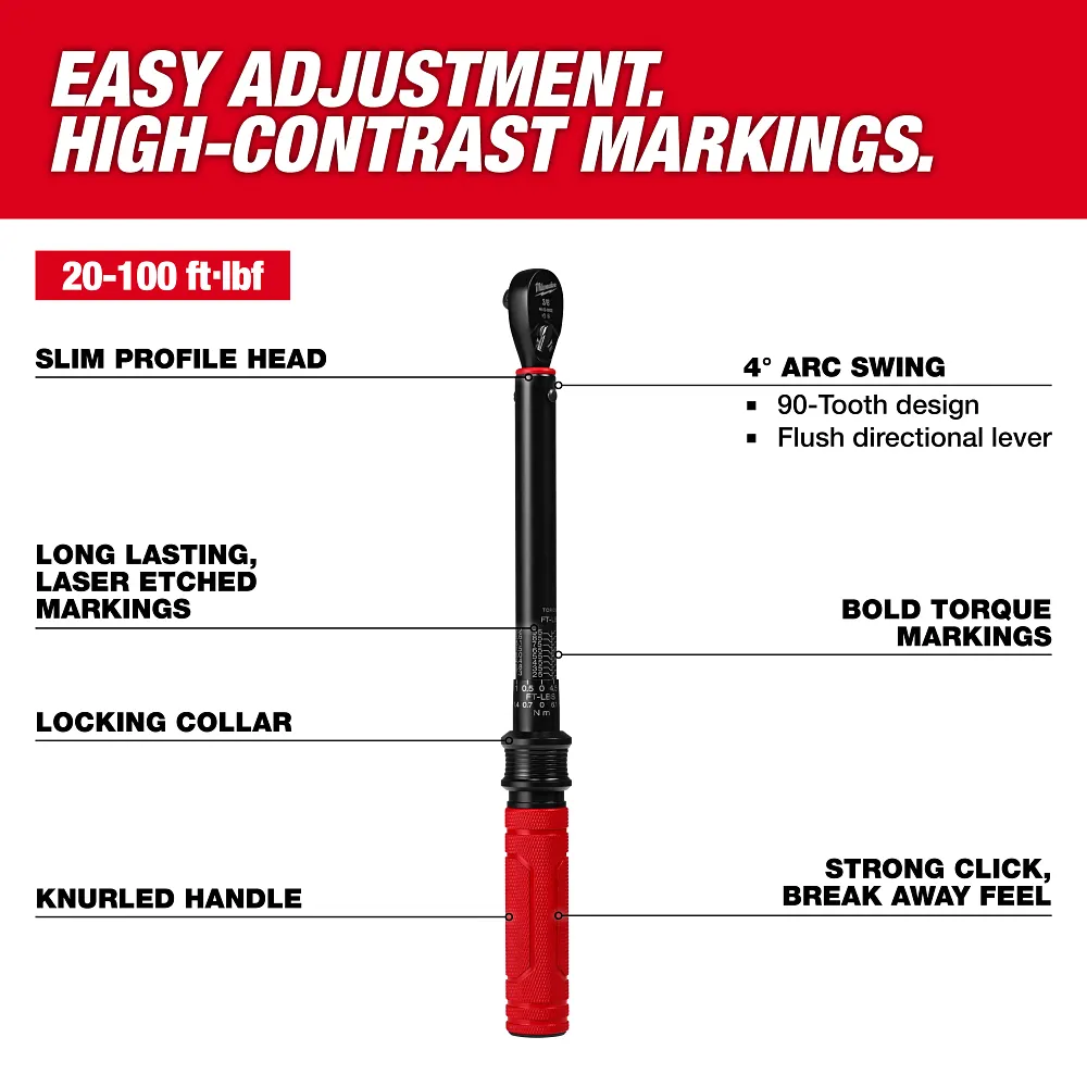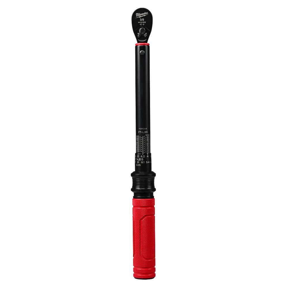 The MILWAUKEE® 3/8” Drive Click Torque Wrench with 20 – 100 ft·lbf of precise torque provides easy adjustment and high contrast markings for quick and accurate torque setting. The bold torque markings drive efficiency when adjusting the torque value, while the long lasting, laser etched markings ensure quality and durability over time. A strong break away feel and audible click give clear feedback when the target torque is reached. With a 4° arc swing, this wrench allows access in tight spaces, and its ±3% accuracy ensures consistent, reliable performance. The all-metal knurled handle provides a secure, comfortable grip for maximum control. The Milwaukee® Click Torque wrench is backed by a 2-year limited warranty.