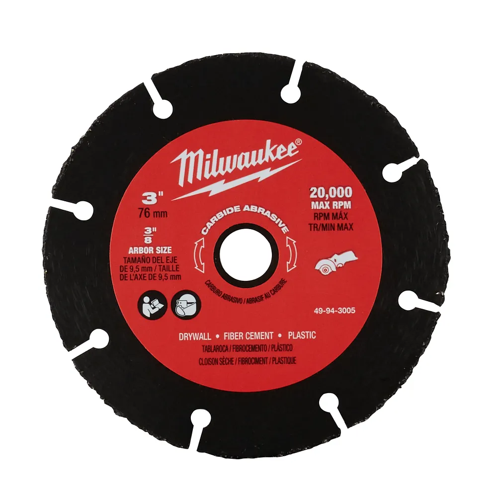 The Milwaukee 49-94-3005 is a 3 in. x Carbide abrasive blade intended to be a general-purpose blade paired with the Milwaukee M12 fuel 3 in. Compact cut off tool (2522). Whether it’s drywall, cement backer board, PVC, plastics, etc. this is blade is a unique solution that delivers the capability to cut a wide range of materials quickly and efficiently.