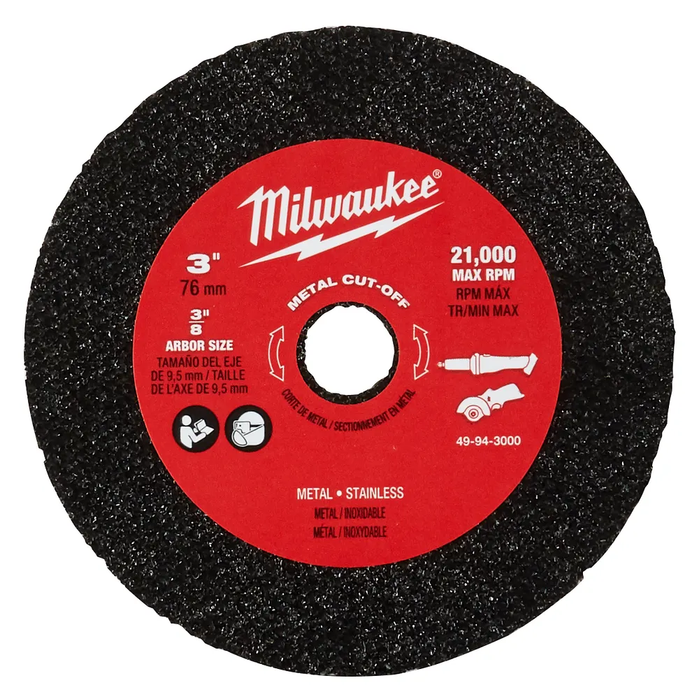 The Milwaukee 49-94-3000 is a three pack of 3 in. x .040 x 3/8 in. cut-off wheels. rated for a maximum 20,000 RPM this wheel is an ideal solution for cutting stainless and other metals quickly and efficiently. Milwaukee’s comprehensive offering of grinding and cutting wheels consists of 45 unique products ranging in diameters from 3 in. to 14 in. with arbor configurations of 3/8 in., 7/8 in., 20 mm, and 5/8 in.. Milwaukee’s abrasive offering provides products ranging from general purpose to specialized high performance applications.
