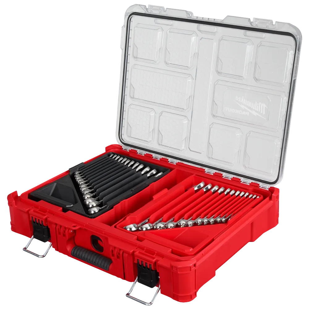 The Milwaukee 30PC Metric & SAE Combination Wrench Set with PACKOUT™ Organizer includes combo wrenches that deliver up to 25% more torque. The MAX BITE™ Open-End Grip improves the wrench’s grip on nuts and bolts, and the geometry reduces rounding and stripping. The I-Beam handle design provides comfort in high torque applications and features easy-to-read ink-filled size labeling. All Milwaukee® Mechanics Hand Tools are backed by a Lifetime Guarantee. The included PACKOUT™ Organizer is part of the Most Versatile Durable Modular Storage System. The Organizer is IP65-rated and built from impact-resistant materials for durability on and off the jobsite. All PACKOUT™ is backed by a Limited Lifetime Warranty.