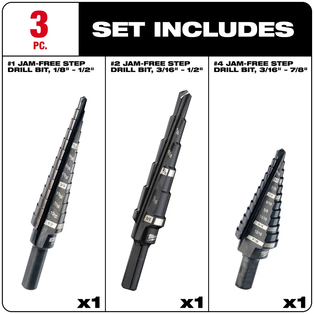Milwaukee® Step drill bits with jam-free performance feature a dual-flute design delivering up to 2X faster hole times, up to 4X longer life and up to 50% more holes per battery charge than competitors. Ideal for drilling small and large-diameter holes in steel and plastic, these bits are optimized for cordless drills in high speed. The Rapid Strike™ tip allows for a fast and accurate start that generates less heat, resulting in longer bit tip life. Black oxide coating also enhances durability, hole quality and bit life. For user convenience and accuracy, each bit has laser-engraved reference marks you can see while drilling. The 3-flat Secure-Grip™ shank ensures a solid connection with the drill chuck. The step drill bit 3-piece set includes bits #1 (48-89-9201), #2 (48-89-9202) and #4 (48-89-9204). Jam-free performance in high speed with most professional 18 Volt cordless drills with lithium-ion battery technology.