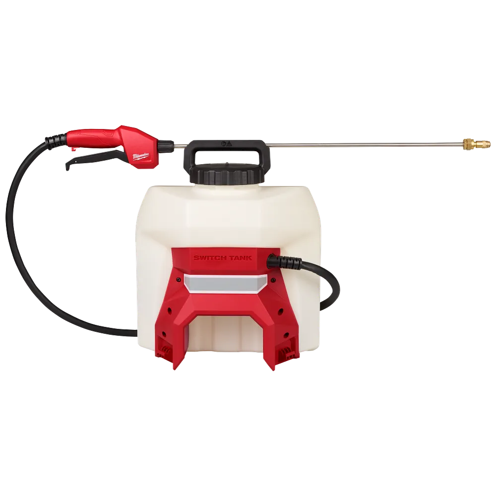 The MILWAUKEE® 4-Gallon Sprayer Tank Assembly w/ SWITCH TANK™ is an interchangeable tank powered by the M18™ Powered Base w/ SWITCH TANK™ (not included). The sprayer tank assembly includes the pump, hose, and wand. The design allows you to add on tank assemblies for different applications, eliminating cross-chemical contamination. The 4-Gallon Sprayer Tank Assembly features a dual diaphragm pump for longer pump life and Viton® seals for increased durability against harsh chemicals. The sprayer tank also has a wide mouth opening for easier pouring and a strainer that filters debris from getting into the tank.