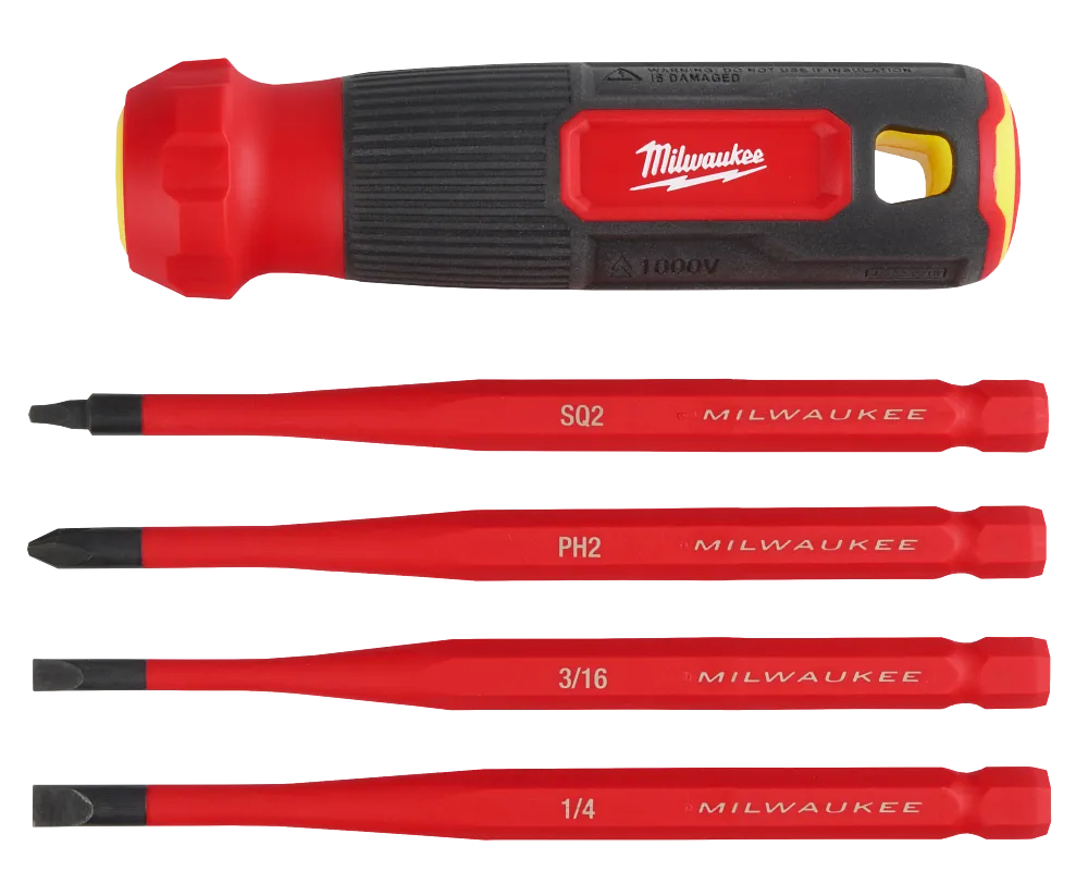 The MILWAUKEE® 4-in-1 1000V Insulated Slim Tip Multi-Bit Screwdriver is more versatile and you can easily swap out bits. It features a flush insulation layer at the screwdriver tip delivering easy access into tight spaces. The 1000V-rated layer of insulation is flame-retardant and impact-resistant. The Milwaukee® 4-in-1 1000V Insulated Slim Tip Multi-Bit Screwdrivers feature a comfortable barrel grip handle and include common tip types such as Phillip’s, Cabinet, and Square. These insulated screwdrivers are UL classified, are certified to IEC 60900 and ASTM F1505 standards for insulated hand tools, and are backed by Milwaukee’s Limited Lifetime Warranty.