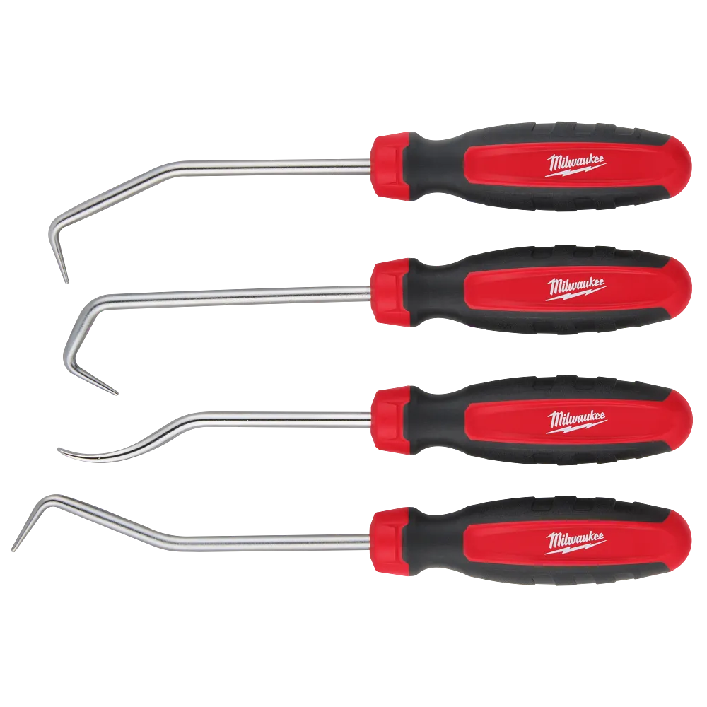 MILWAUKEE® hose picks feature an all-metal core for up to 50% more durability. Each pick has a specific angle for different applications while the reinforced tip resists bending when loosening stubborn hoses. The flat pick provides puncture protection and reduces damage to hoses. Milwaukee Comfort grip handles give you increased tool control and comfort. This set features a hook, 90°, 45°, and flat hose pick along with a durable long-term storage tray for easy access and organization. These chrome-plated picks provide superior rust protection. All MILWAUKEE Mechanics Hand Tools are backed by a lifetime guarantee.