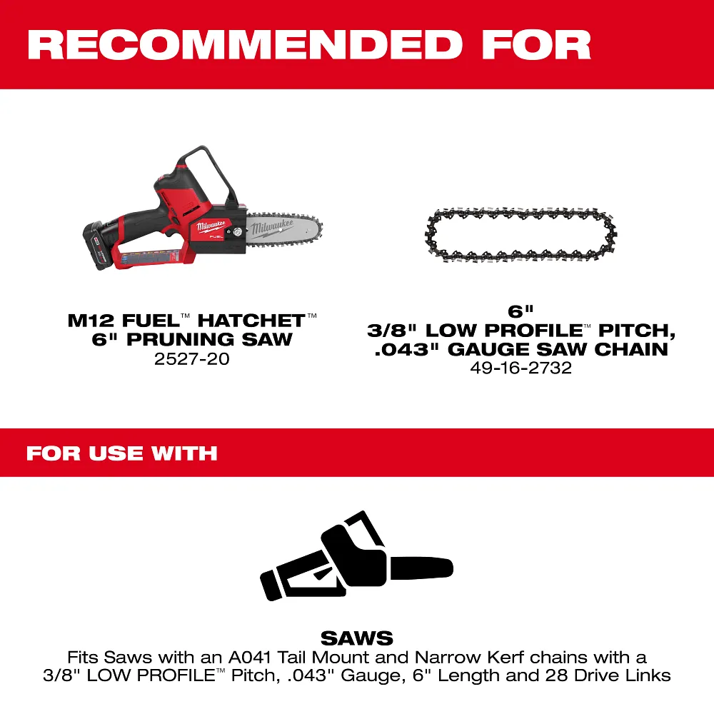 • Recommended for use with M12 FUEL™ HATCHET™ 6” Pruning Saw (2527-20) and 6″ 3/8″ LOW PROFILE™ Pitch, .043″ Gauge Saw Chain (49-16-2732)
