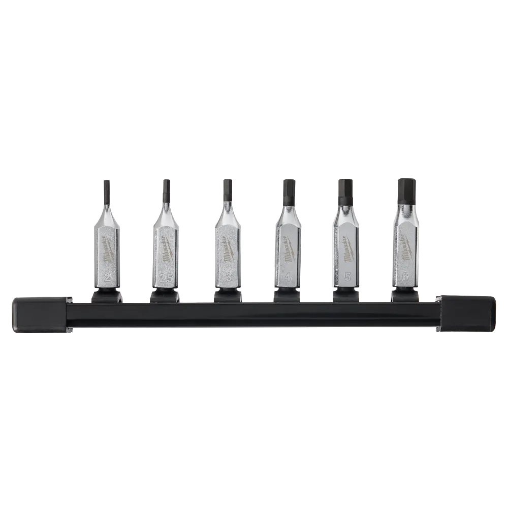 The MILWAUKEE® 6PC 1/4″ Drive Metric Hex Bit Socket Set with FOUR FLAT™ sides is designed from the ground up to be part of the most versatile socket family. Milwaukee® bit sockets feature an innovative design with four parallel flat sides, which deter rolling and are wrench-compatible. This also creates a slim profile to provide the best access in tight spaces. The one-piece socket design offers improved durability compared to two-piece designs by eliminating the risk of the bit separating from the socket base. This set includes a storage rail for better organization. Laser engraved size markings provide easy identification and chrome plating offers rust and corrosion protection. All Milwaukee® bit sockets are backed by a Lifetime Guarantee.