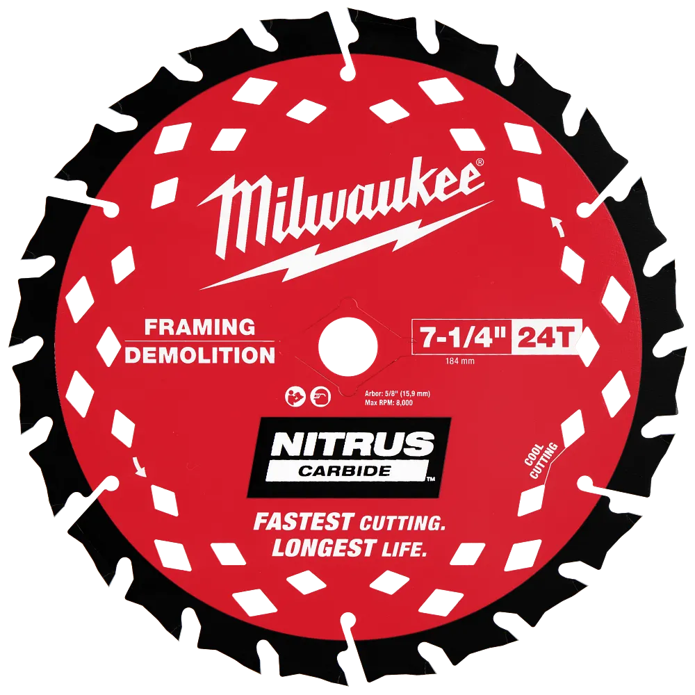 The MILWAUKEE® 7-1/4” 24T NITRUS™ Carbide Framing & Demolition Circular Saw Blade offers the Fastest Cutting and Longest Life in Framing and Demolition Applications. The NITRUS™ Carbide performance provides the ability to take this blade from aggressive demolition applications back to clean wood cutting, which reduces blade changes and maximizes productivity. This NITRUS™ Carbide blade delivers unmatched durability – equipped to handle 400+ Nails, 50+ screws, and 120+ ft of shingles. With the sharpest, longest-lasting – welded carbide teeth, this framing & demo blade cuts the toughest materials on the job site with ease, offering up to 5x life in wood with nails vs. the leading competitor. This blade is also equipped with cool cutting diamond vents, reducing heat buildup to deliver straighter cuts. The NITRUS™ Carbide blade outperforms competitive solutions, so you can use one blade, demo to frame.