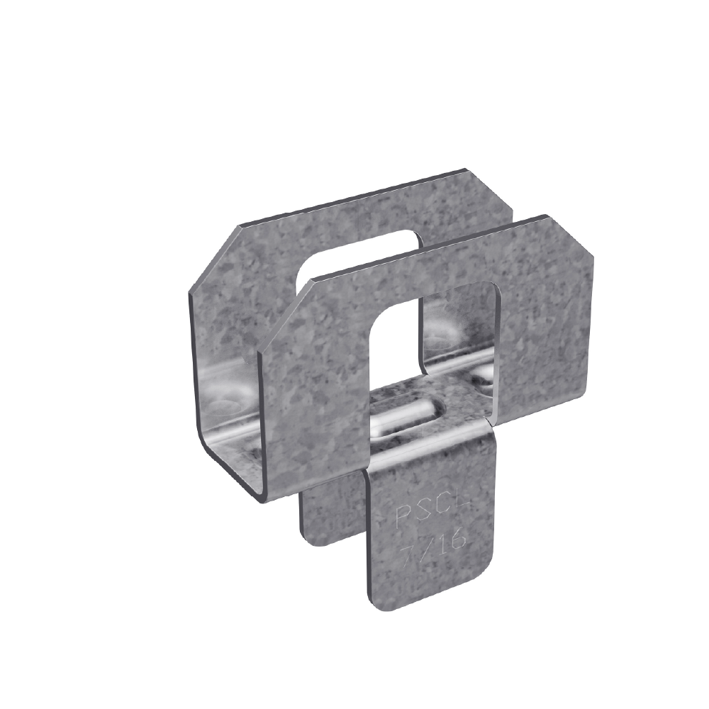 The PSCL is designed to brace unsupported sheathing edges when sheathing meets edge to edge without a rafter for support. This light sheathing clip provides a 1/8″ gap to address shrinkage and expansion of roof sheathing. Inserted over the edges of adjacent plywood panels, the PSCL reduces deflection and keeps panels even to maintain a level plane on the structure.