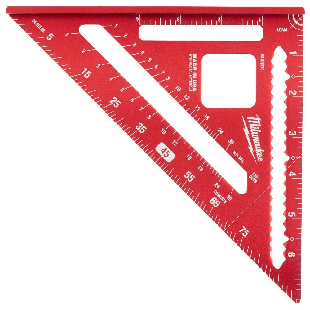 The MILWAUKEE® 7″ rafter square has a stronger frame and is the most versatile rafter square. Scribe notches from 1″ – 6″ allow for easy ripping of lumber. A 1″ cutout helps prop pipe making it easier to cut on the job site. A reinforced frame provides durability on the job site and high visibility laser etched markings make it easy to read.