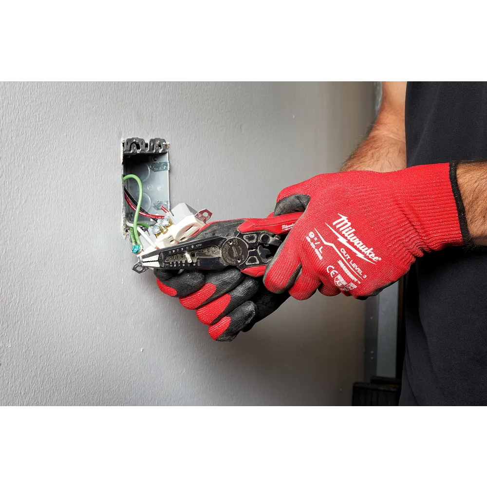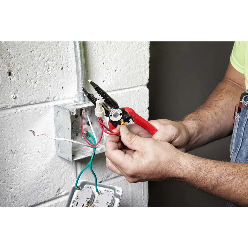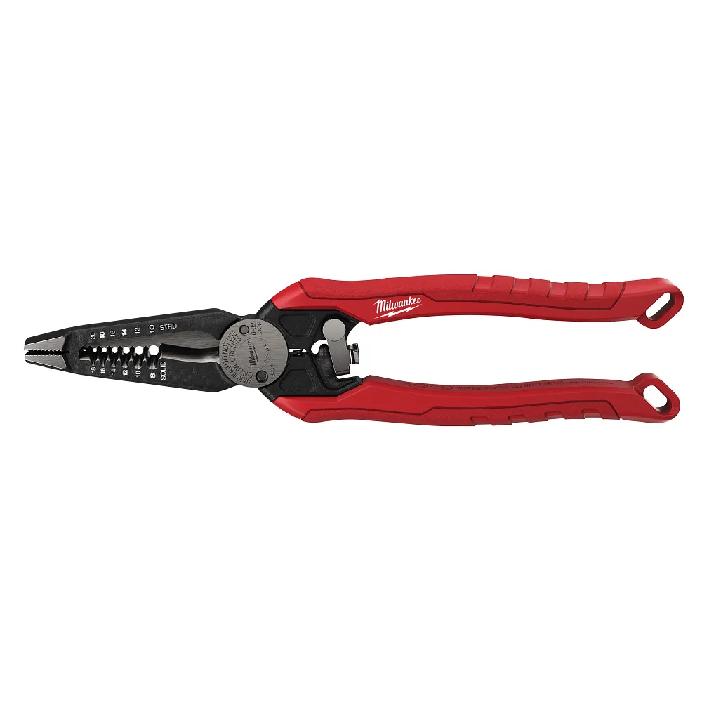 The MILWAUKEE® 7-in-1 High-Leverage Combination Pliers feature seven core functions for electrical installation. The wide jaw pliers make grabbing and twisting wire easy, while the crimper provides added functionality when working with both insulated and non-insulated terminals. The wire cutter, wire stripper, and loop maker allow for quick wire preparation. These Milwaukee pliers with a built-in reamer allow reaming ½” through 1” conduit, while the bolt cutter cuts #6 and #8 bolts. A swing-lock design delivers fast, one-handed operation, and the high-leverage handles make cutting and crimping easier. The 7-in-1 electrical pliers provide maximum productivity and are perfect for the toughest jobsites.