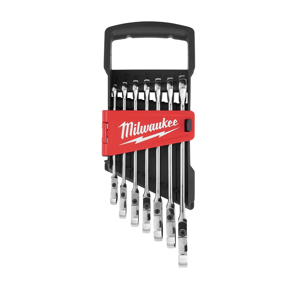 The MILWAUKEE® 7 Piece Metric Flex Head Ratcheting Combination Wrench Set features 2.5 degrees of arc swing and 144 ratcheting positions, allowing quick and efficient work in tight spaces. The flex head wrenches have double-stacked pawls within the ratcheting mechanism, which increases durability and extends the life of the tools. The flexible head allows for increased accessibility in areas that are difficult to reach. The MAXBITE™ Open-End Grip improves the wrench’s grip on nuts and bolts, offering 25% more torque than smooth-faced wrenches. This flex head wrench set feature ergonomic I-Beam handles designed for improved comfort and ink-filled size labels for easy size identification and quick distinction between SAE and metric sets. The 7-piece kits comes in a portable, locking storage tray, offering organization both on and off the jobsite. Milwaukee combination wrenches feature a lifetime guarantee.