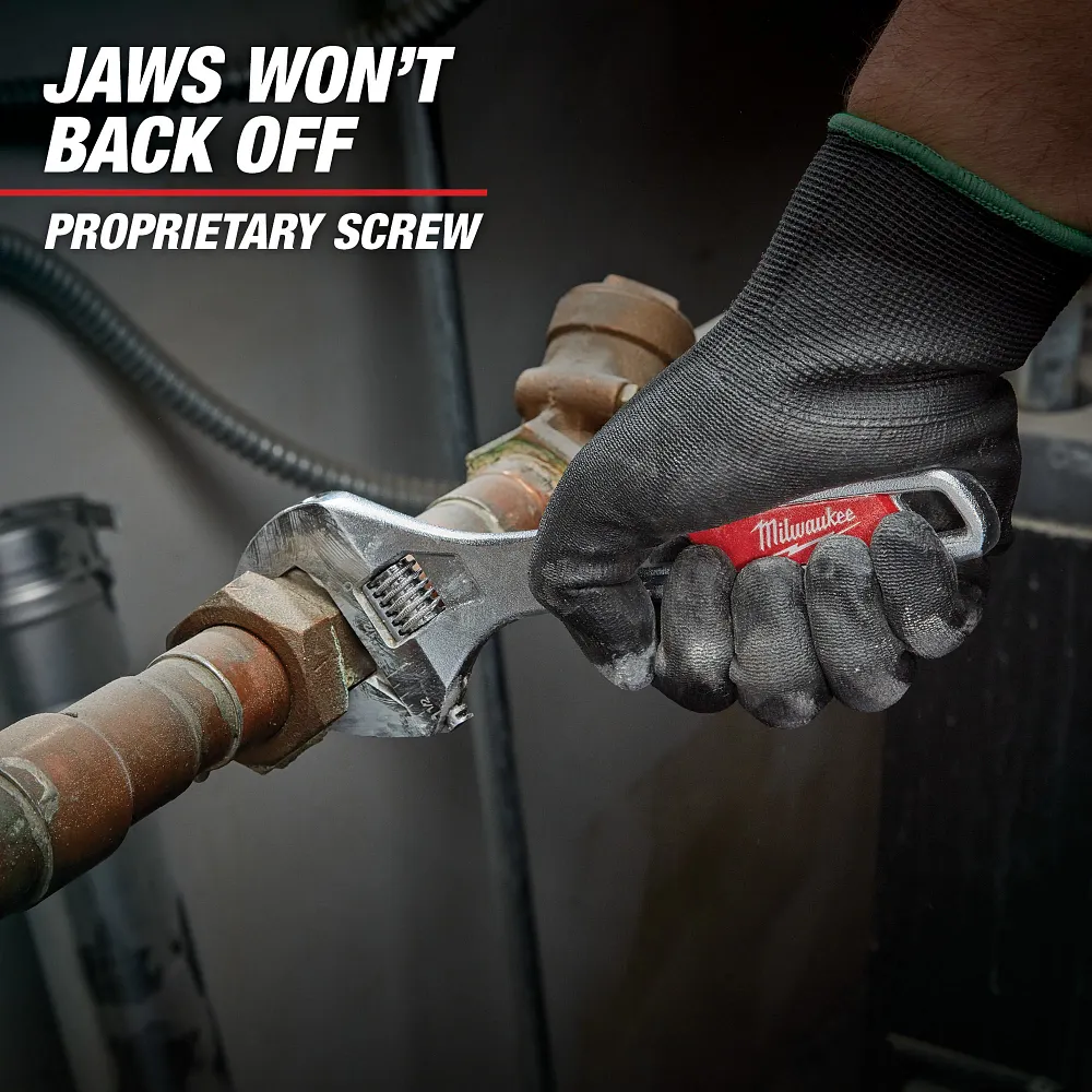 Milwaukee 48-22-7508, 8 in. wide jaw adjustable wrench has been designed from the ground up to offer maximum productivity to the professional user. The 8 in. wide jaw adjustable wrench features a wide jaw design for increased capacity in confined environments as well as a proprietary adjustment screw for jaws that won’t back off. The ergonomic handle form has been designed for maximum comfort and won’t dig into the palms, and is chrome plated for rust protection and maximum tool life. The wrench’s parallel jaw design won’t slip or damage finish surfaces, and a tether-ready handle loop makes the Milwaukee 48-22-7508 perfect for the toughest of jobsites. Milwaukee stands behind their product and offers a Limited Lifetime Warranty with all adjustable wrenches. The Milwaukee 48-22-7508 includes (1) 48-22-7508 8 in. wide jaw adjustable wrench.