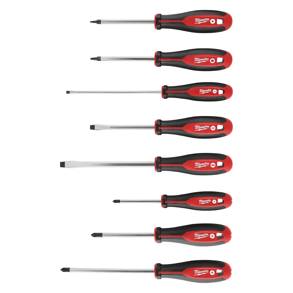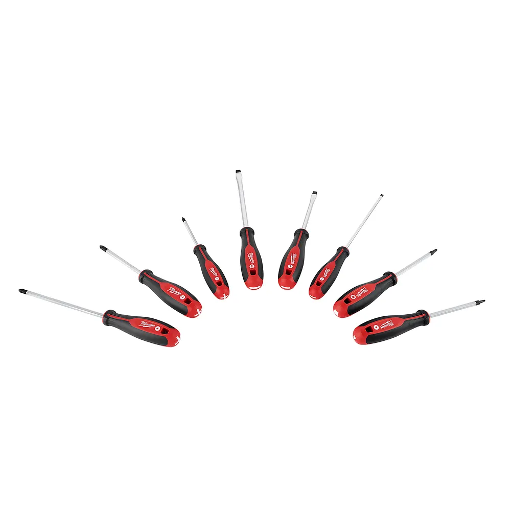 Featuring hardened tips & forged shanks the Milwaukee® 8 piece screwdriver set provides professional grade solutions and durability to the user. Bit types are marked on the cap of each tool for quick identification and increased efficiency. The comfortable tri-lobe handle allows users to comfortably apply more leverage.