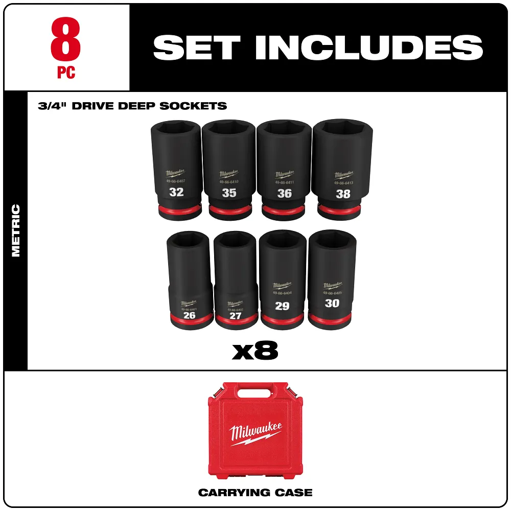 The MILWAUKEE® 8-Piece SHOCKWAVE Impact Duty™ 3/4 in. Drive Metric Deep 6 Point Socket Set features the boldest, longest-lasting markings and extreme impact durability in high torque applications. The stamped and ink-filled size marking makes selecting the right socket every time easy throughout the life of the socket. These Milwaukee sockets are engineered with high strength forged steel for optimized performance in heavy-duty applications. The non-slip hex geometry prevents fastener rounding, and a dual-hole design and ring groove allow for easy socket attachment and removal. The storage cases are impact resistant and nest together for easy stacking and storage. All SHOCKWAVE Impact Duty™ Sockets backed by a Lifetime Guarantee and meet ASME industry standards.