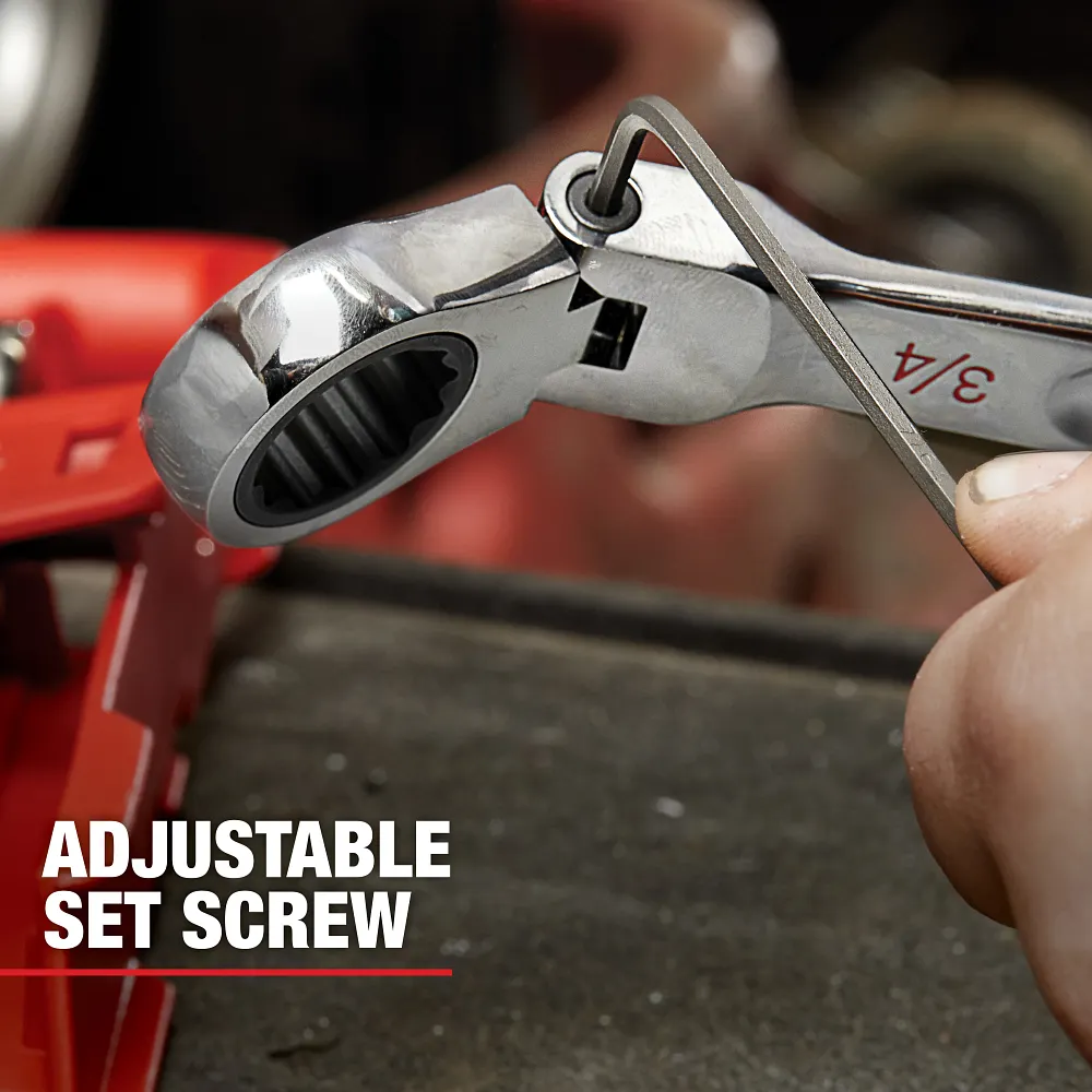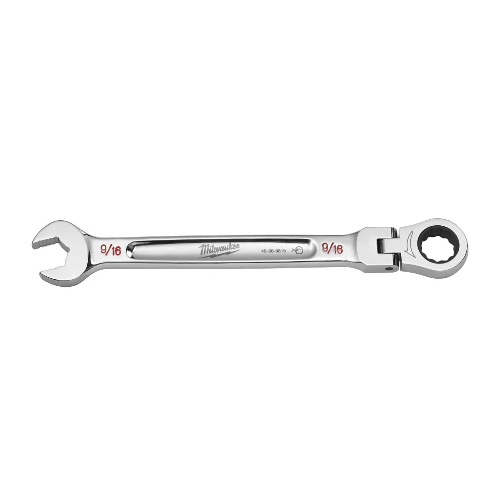 The MILWAUKEE® 9/16″ Flex Head Ratcheting Combination Wrench features 2.5 degrees of arc swing and 144 ratcheting positions, allowing quick and efficient work in tight spaces. The flex head wrenches have double-stacked pawls within the ratcheting mechanism, which increases durability and extends the life of the tools. The flexible head allows for increased accessibility in areas that are difficult to reach. The MAXBITE™ Open-End Grip improves the wrench’s grip on nuts and bolts, offering 25% more torque than smooth-faced wrenches. This flex head wrench features ergonomic I-Beam handles designed for improved comfort and ink-filled size labels for easy size identification and quick distinction between SAE and metric sets. Milwaukee combination wrenches feature a lifetime guarantee.