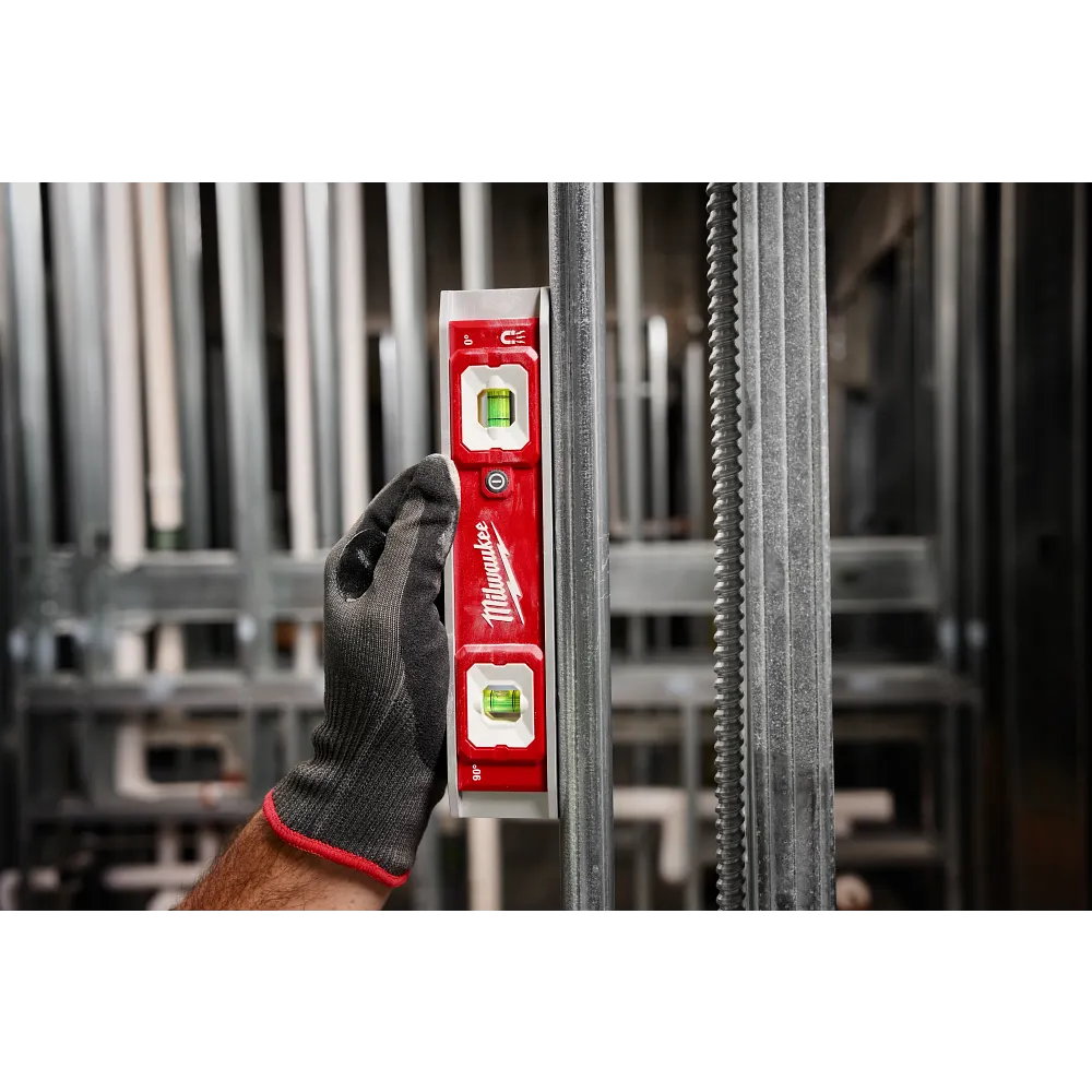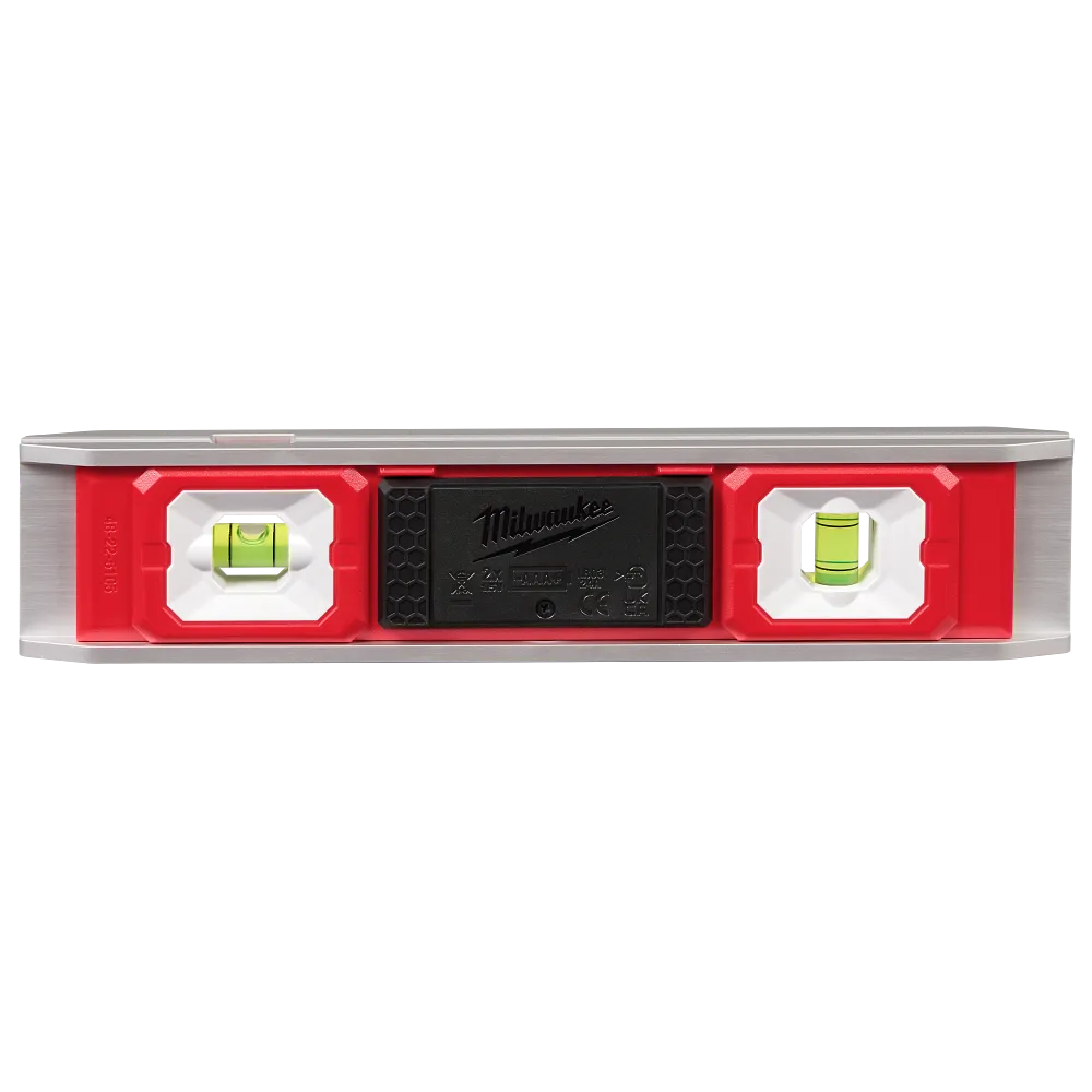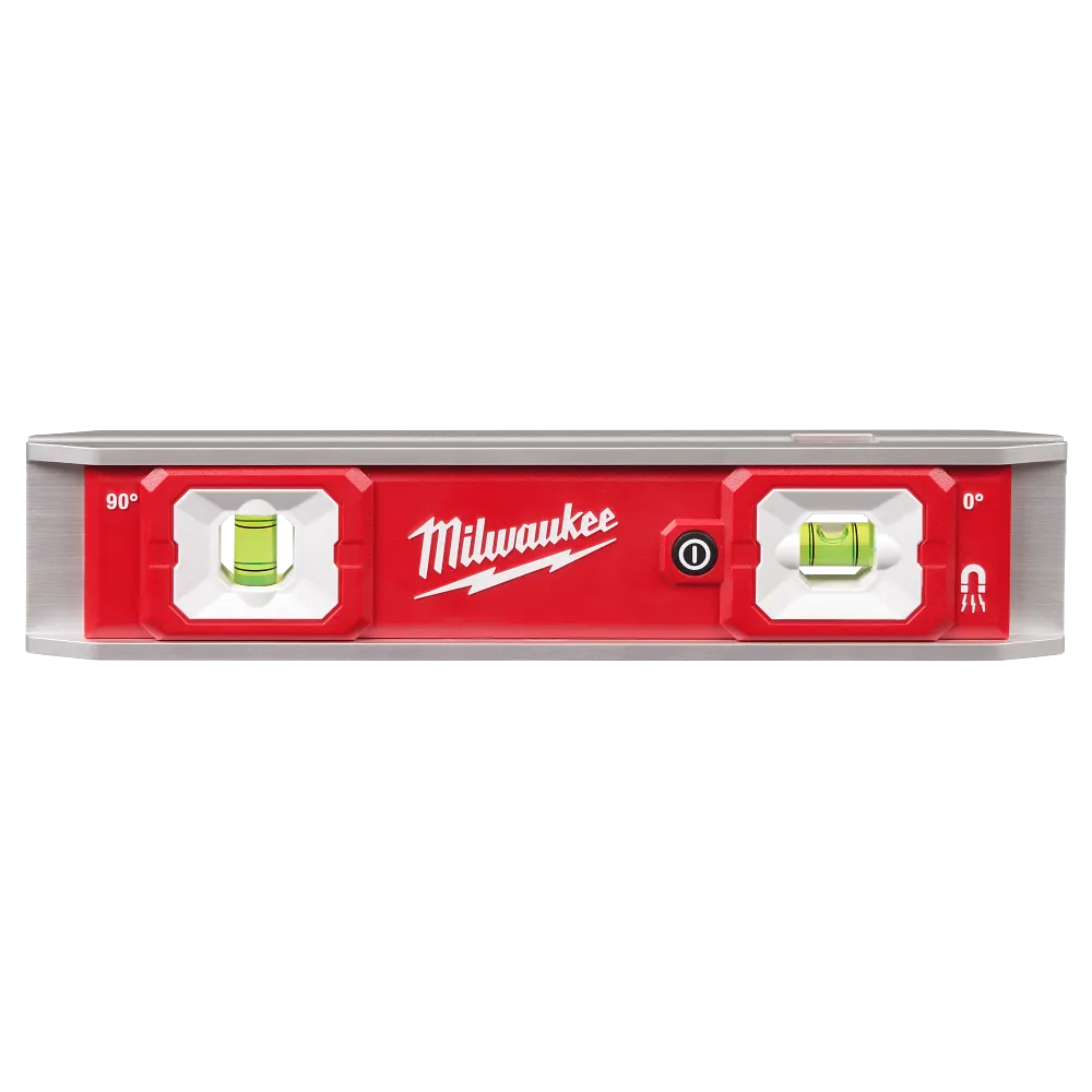 The MILWAUKEE® 9” Torpedo Level with Lighted Vials provides better vial visibility in poorly lit environments. Each vial is lit with bright dual LEDs and the high-contrast surrounds deliver clear readings. The level also has a durable aluminum frame protecting it from drops and harsh jobsite conditions. The 3 rare earth magnets on the frame make working with conduit and other metals easier; and the rubber wall grip grabs onto the surface when leveling trim, shelving, windows, and outlets. The level is powered with (2) AAA batteries (included) and the vials have an automatic shut off after 3 minutes to preserve battery life. The 9” Torpedo Level with Lighted Vials is backed by a limited lifetime warranty on the frame and vials and a 1-year limited warranty on the electronics.