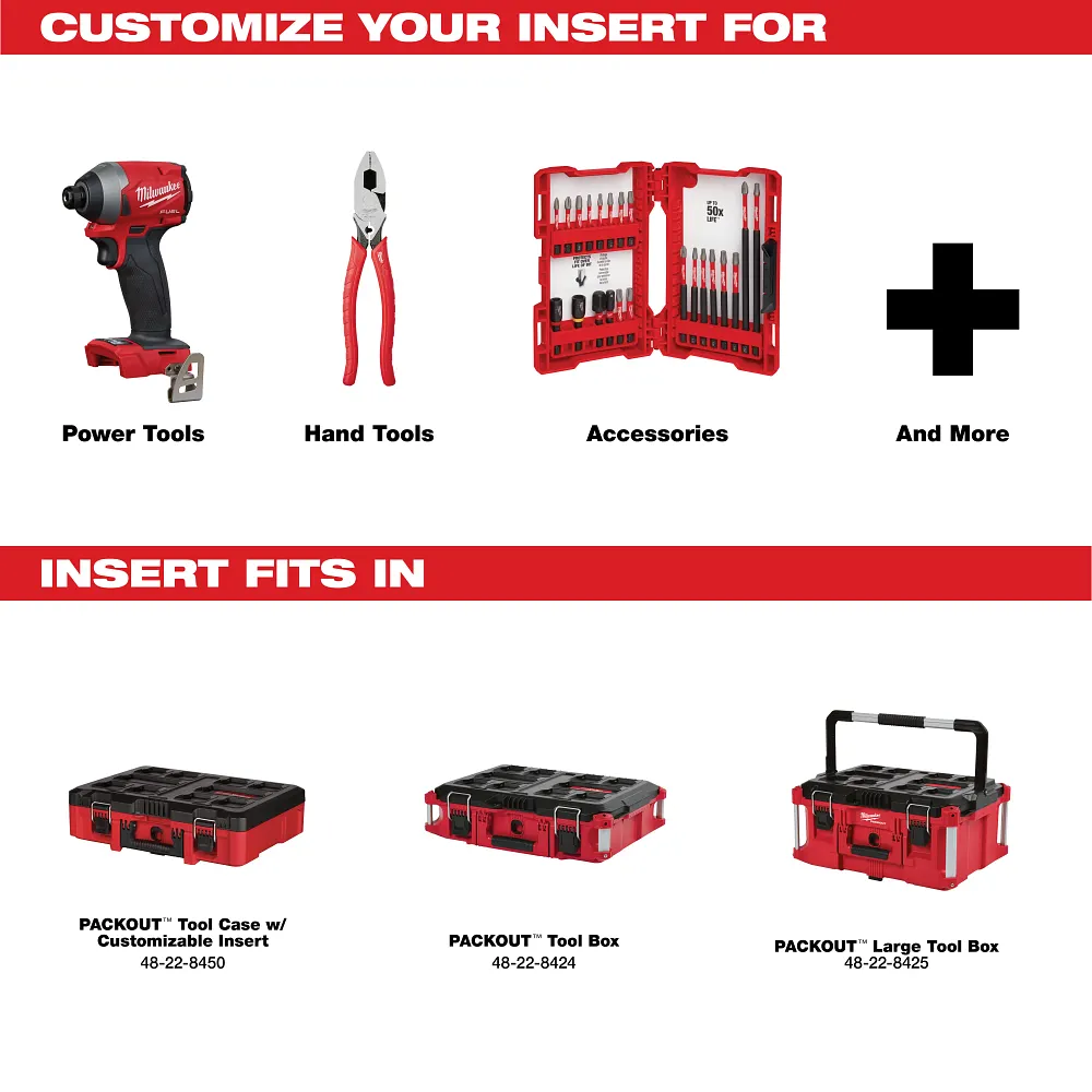 The MILWAUKEE® Customizable Foam allows users to fully customize their storage cutting out custom slots to securely store and protect tools. This versatile insert fits in all PACKOUT™ tool boxes and tool cases (48-22-8424, 48-22-8425, 48-22-8450).
