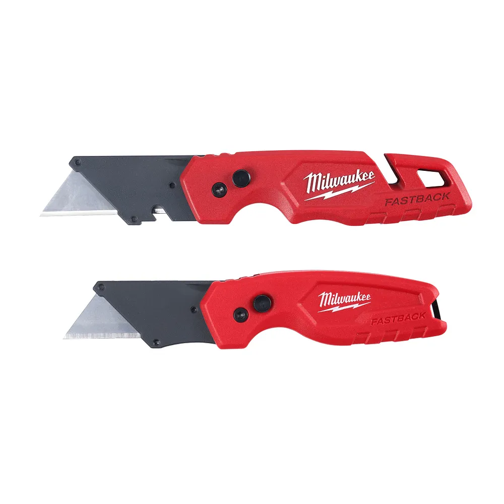 The MILWAUKEE® FASTBACK™ Folding Utility Knife Set includes the FASTBACK™ Folding Utility Knife with Blade Storage and the FASTBACK™ Compact Folding Utility Knife. Both Milwaukee knives feature a press and flip mechanism for easy, one-handed opening. The utility knives allow for make quick, tool-free blade changes with a metal extension over the button prevents accidental blade removal for maximum efficiency. Both press and flip open utility knives have a durable wire belt clip to reduce pocket tearing. The FASTBACK™ Folding Utility Knife with Blade Storage has an integrated gut hook and wire stripper for increase versatility. The metal body on the FASTBACK™ Folding Utility Knife w/ Blade Storage provides durability and the onboard blade storage holds up to 5 extra blades. The small utility knife is compact for easy storage.