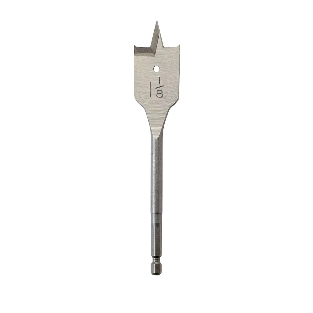 Bore small, clean holes at any angle in a variety of materials with the economical Milwaukee® 1-1/8 in. x 6 in. flat boring bit. This premium quality flat boring bit is made of heat-treated high carbon steel, so the drill point and cutting edge can be resharpened for cost savings and long life. Bore clean, fast holes at any angle in wood, plastic, plywood and Formica. This bit offers a 6 in. drilling depth but can be used with a 12 in. extension (48-28-3350) for extended deep-hole drilling.