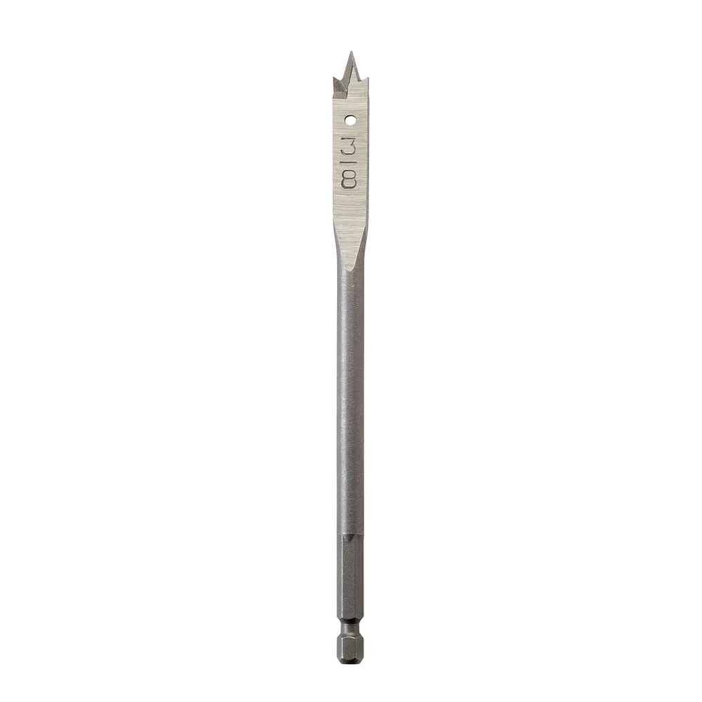 Bore small, clean holes at any angle in a variety of materials with the economical Milwaukee® 3/8 in. x 6 in. flat boring bit. This premium quality flat boring bit is made of heat-treated high carbon steel, so the drill point and cutting edge can be resharpened for cost savings and long life. Bore clean, fast holes at any angle in wood, plastic, plywood and Formica. This bit offers a 6 in. drilling depth but can be used with a 12 in. extension (48-28-3350) for extended deep-hole drilling. 3/16 in. shank diameter.