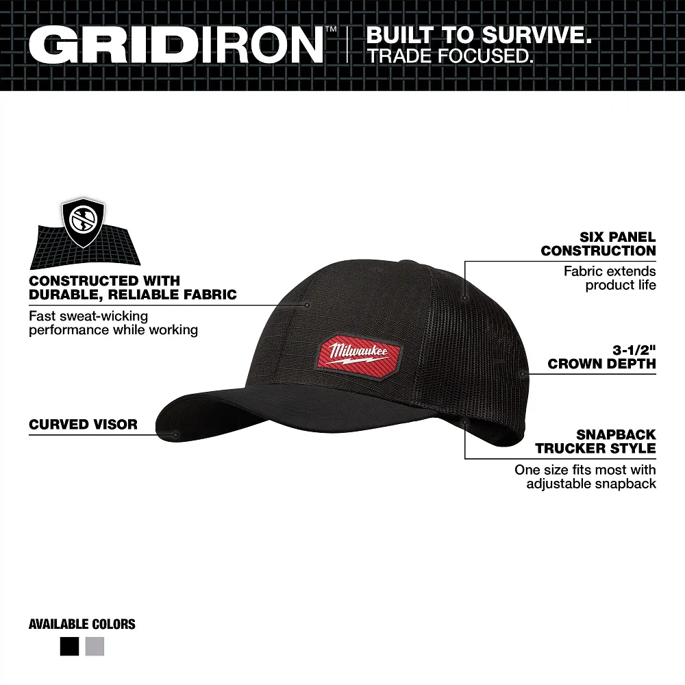 Part of the MILWAUKEE® GRIDIRON™ Collection, our Snapback Trucker Hat is BUILT TO SURVIVE. Our Milwaukee® GRIDIRON™ Black Snapback Trucker Hat is made with a breathable and lightweight combination of cotton, polyester, and nylon. This bold curved bill hat is the best option for users looking for headwear on or off the job site. The curved visor provides shade from direct sunlight whether you’re on the job site or enjoying time outdoors. The front panel of the six-panel trucker cap is built from GRIDIRON™ Ripstop Polyester, delivering added durability and a rugged look.