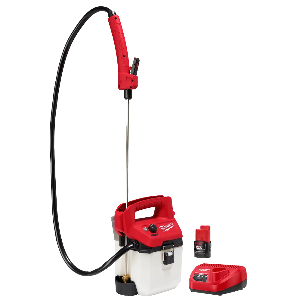 The MILWAUKEE® M12™ One Gallon Handheld Sprayer delivers the best pressure control and no manual pumping. Designed to meet the needs of professional landscape maintenance and pest control, the battery-powered handheld sprayer provides you with instant, constant and adjustable pressure up to 80 PSI and a 17 ft vertical spray distance. The 3-mode pressure adjustment knob adjusts the pressure between 20 – 80 PSI, giving you the capability to complete a wide range of applications. Our M12™ REDLITHIUM™ CP2.0 Battery provides you with up to 80 gallons of spraying per charge. The M12™ Handheld Sprayer Powered Head is compatible with both the 1 Gallon and 2 Gallon Handheld Sprayer Tank, providing the ability to rightsize the tank for the application and premix multiple tanks to increase productivity. The handheld sprayer can be used both one and two-handed for added versatility. The sprayer features an onboard measuring cup for quick measurement, a strainer that filters debris from entering the tank, and vertical and horizontal wand storage. The MILWAUKEE® M12™ Handheld Sprayer is part of the M12™ System which is fully compatible with over 125 solutions.