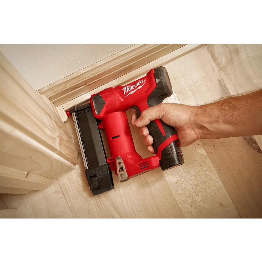 The MILWAUKEE® M12™ 23 Gauge Pin Nailer is the most compact cordless pin nailer, combining precision and power to deliver the performance that professional carpenters and remodelers demand, without the hassle of a compressor hose or gas cartridge. The 23 gauge pin nailer provides unmatched productivity and accessibility into tight spaces and confined corners with a lightweight, ergonomic design. The nitrogen air spring mechanism allows the nailer to consistently sink pin nails at proper depth into hard or softwoods while leaving small, clean nail holes. The double-action trigger and non-marring precision point tip allow for sequential driving and accurate pin placement into delicate trim pieces. The dry-fire lockout feature prevents misfires and workpiece damage. The M12™ Pin Nailer drives 23-gauge headless pin nails ranging in length from 1/2” to 1-3/8” and features all-day run time with up to 750 pin nails per charge when paired with an M12™ REDLITHIUM™ CP1.5 battery pack. This battery-powered pin nailer also features a magazine reload indicator, tool-free drive depth adjustment, reversible belt clip, LED light, battery fuel gauge, secondary work contact tip, and carries an industry-leading 3-year limited power tool warranty.