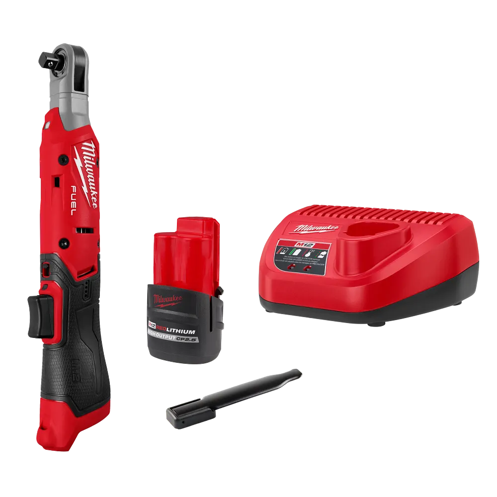 The MILWAUKEE® M12 FUEL™ 3/8″ Ratchet redefines productivity, capability, & comfort for users looking for the ultimate cordless ratchet to tackle any job. Our new POWERSTATE™ Brushless outer rotor motor delivers the BEST COMBINATION OF POWER AND SPEED with 70 ft-lbs of torque to breakaway stubborn fasteners, & 400 RPM to remove and install fasteners at higher rates of speed. This solution also delivers the MOST COMPACT HEAD & BODY SIZE to allow users full body access into tight spaces, maintaining a 3/4″ head profile & at only 1.5 lbs bare tool, without sacrificing durability. The M12 FUEL™ Ratchet provides users UNMATCHED COMFORT with a dedicated contoured grip & reduces fatigue during a full day of wrenching. Also featuring a new to world modular trigger cap, this will allow users to switch between various button or paddle trigger configurations for customizable comfort. Equipped with a targeted LED work light, battery isolation system, and optimized forward reverse shuttle, this ratchet tackles core user frustrations and delivers uncompromising performance. It also includes a charger and an M12 High Output 2.5ah battery for greater performance and a chemical-resistant housing from common oils, greases, and solvents.