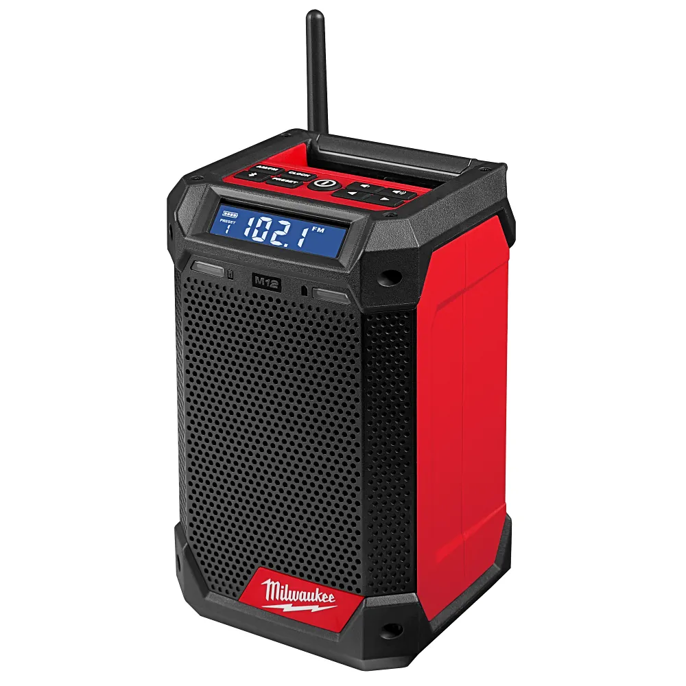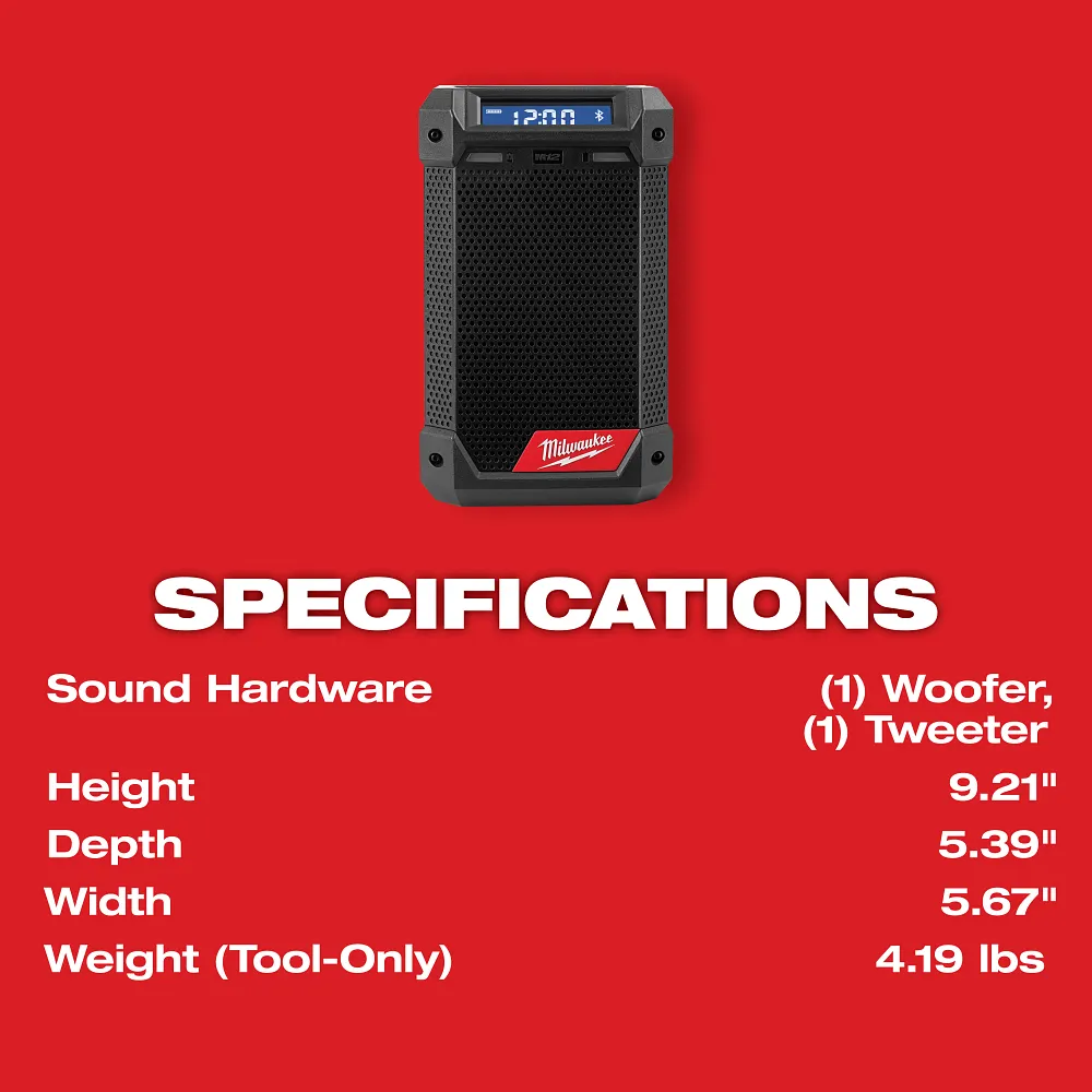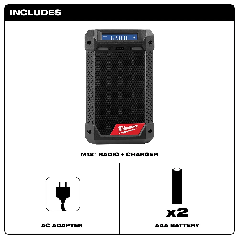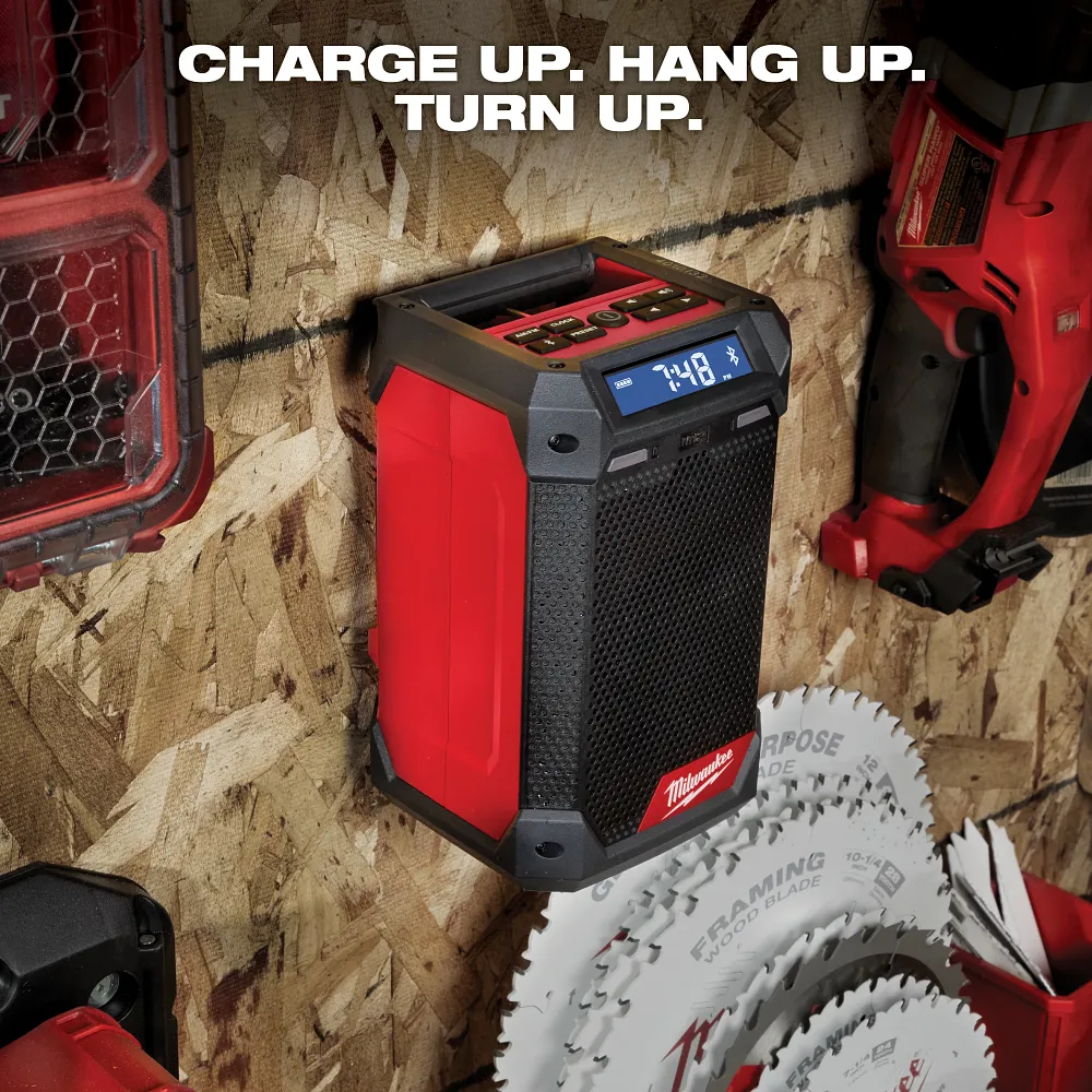 CHARGE UP. HANG UP. TURN UP with the MILWAUKEE® M12™ Radio + Charger. This Bluetooth speaker with radio delivers unmatched sound for its size to turn it up on and off the jobsite. The speaker radio has built-in hanging features that enhance portability while allowing it to be hung up anywhere. A sleek design with integrated, concealed features and an IP54 rating provide increased durability. Achieve 10 hours of runtime on a CP 2.0, or use the 12V DC port to keep any M12™ batteries charged up throughout the day.