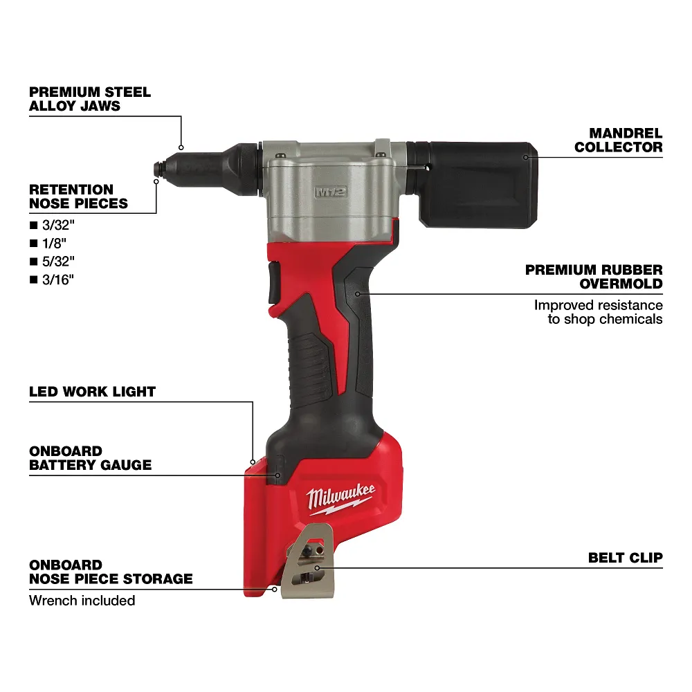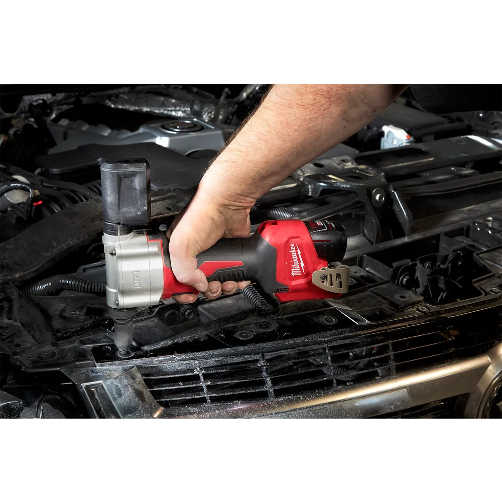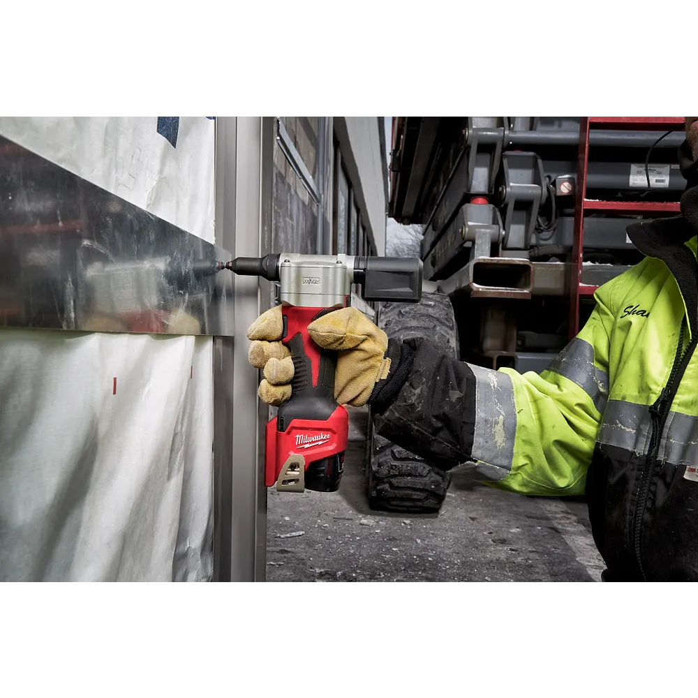 The M12™ rivet tool is the first cordless solution that delivers fast, easy riveting while maintaining performance, durability, and size. The 2550-20 can pull up to 3/16 in. stainless steel rivets, 450 pcs. of 1/8 in. steel rivets on one 1.5 amp hour charge, and reduces muscle effort from a hand tool by over 60%. No compressors or hoses during set up and operation makes this tool a great replacement to pneumatic products. 2X longer life over current cordless solutions delivers greater durability from common jobsite conditions and use. This is the most compact cordless rivet tool on the market, measuring only 6.5 in. in length allowing users more access in tight spaces. The M12 rivet tool is part of the M12 battery platform, offering 90+ solutions on one battery system.