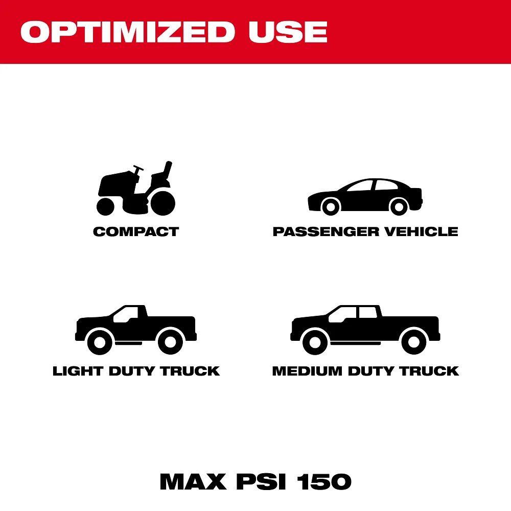 MILWAUKEE® FASTEST 18V CORDLESS TIRE INFLATOR. The MILWAUKEE® M18™ Inflator delivers fast, accurate, easy inflation with the portability to take anywhere. Optimized for passenger, light truck, and other medium-duty tires. Rated to deliver max 150PSI, the high-efficiency motor tops-off 33” light truck tires in under 1 minute. The TrueFill™ Technology features an auto-pressure check that is designed to WAIT for the pressure to stabilize, CHECK the system pressure, and FILL until the desired target is reached. In addition, an Auto Shut-Off feature will stop inflation at selected PSI to prevent overinflation allowing users to set it & forget it. Furthermore, the unit includes 4 PSI memory slots, anti-vibration feet, a 36” inch hose with an all-brass Schrader chuck, and an on-board hose and nozzle storage.