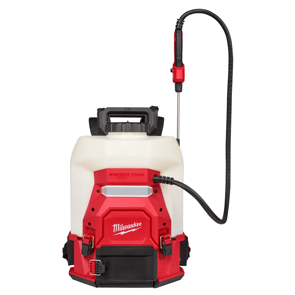 The MILWAUKEE® M18™ 4-Gallon Backpack Sprayer w/ SWITCH TANK™ delivers the industry’s best pressure control with no manual pumping and an interchangeable tank design. Designed to meet the needs of professional landscape maintenance, the battery-powered backpack sprayer provides instant, constant, and adjustable pressure up to 140 PSI and a 24 ft vertical spray distance. The 5-mode flow rate knob adjusts the flow rate from 0.1 – 0.52 GPM, allowing you the capability to complete a wide range of applications. Our M18™ REDLITHIUM™ XC4.0 Battery (sold separately) provides you with up to 20 tanks of spraying per charge (on Mode 3). The 4-Gallon Sprayer Tank Assembly features a dual-diaphragm pump for longer pump life and Viton® seals for increased durability against harsh chemicals. The sprayer tank features an optimized design for better weight distribution, a wide mouth opening for easier pouring, and a strainer that filters debris from getting into the tank. The backpack frame includes padded straps, lumbar support, and a hip belt, giving you added comfort during extended spraying applications. The 4-Gallon Sprayer is made up of two components – the M18™ Powered Base and the 4-Gallon Sprayer Tank Assembly. The Powered Base includes the motor, battery compartment, and REDLINK™ electronics, while the interchangeable Tank Assembly includes the pump, hose, and wand. The isolated pump, hose, and wand design allows you to add on tank assemblies for different spraying applications, eliminating cross-chemical contamination. The Powered Base is compatible with the 4-Gallon Water Supply Tank Assembly (49-16-19WS). Our M18™ 4-Gallon Backpack Sprayer w/ SWITCH TANK™ is part of the M18™ system, which is fully compatible with over 300+ tools.