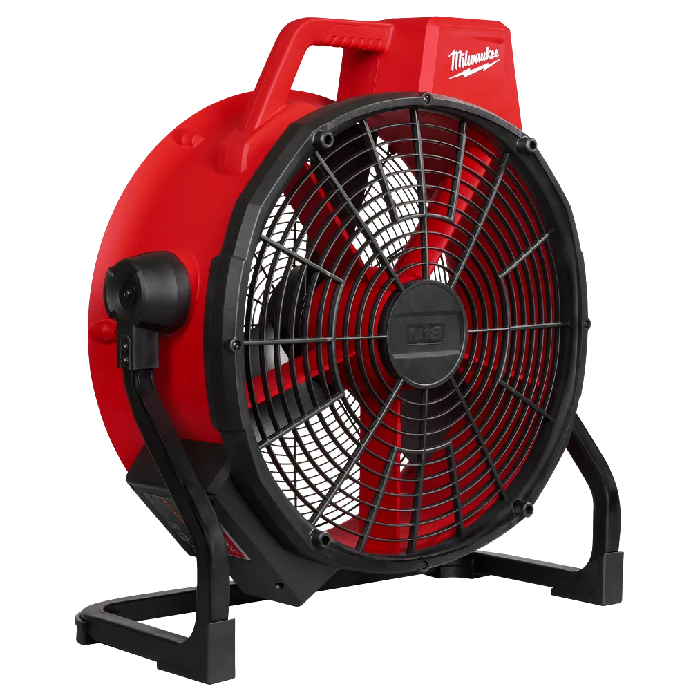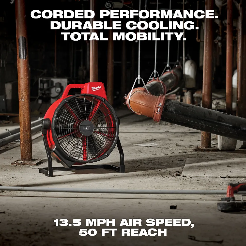 The MILWAUKEE® M18™ Brushless 18” Fan delivers corded performance anywhere on the job site, providing air circulation over 50 ft and up to 13.5 MPH. The 18-inch blade and brushless motor quickly propels air, allowing for fast and efficient cooling, drying, or ventilation. The reinforced metal base and shroud design withstands demanding job site environments and delivers impact, water, and dust resistance. This lightweight, mobile fan can adapt to any location with 360 degrees of rotation and 5 hours of use on high with the M18™ HD12.0. The integrated AC plug offers the versatility to plug in a standard extension cord for extended runtime. For optimized storage and transportation, this fan has an interlocking stackable design. The new M18™ Brushless 18” Fan delivers CORDED PERFORMANCE. DURABLE COOLING. TOTAL MOBILITY.
