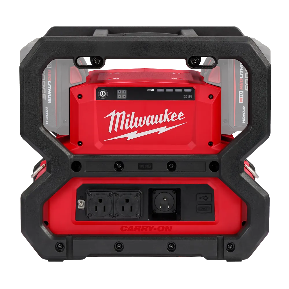 The MILWAUKEE® M18™ CARRY-ON™ 3600W / 1800W Power Supply provides the most versatile 15A power for the jobsite, with less hassle. The power supply delivers 3600 starting watts,1800 running watts of pure sine wave inverter energy with longer sustained power. Users can run demanding trade tools, such as table saws, pancake compressors, or even pipe threaders. Power everything from 15A tools to your sensitive electronics, with instant start technology and better-sustained power. With a combination of any MILWAUKEE® M18™ batteries, users can power any 15A products and minimize hassles typically associated with power on the jobsite. The quiet, compact, emissions-free cordless Power Supply can operate indoors and underground, including confined spaces, scissor lifts, and utility carts. The lightweight and compact design of the CARRY-ON™ Power Supply allows users to have power by their side, instead of relying on gas alternatives and extension cords. The M18 CARRY-ON™ can only run on 4 batteries. Users can charge M18™ Batteries simultaneously at a 3A standard rate when the product is not in discharge mode. Prevent battery theft with lockable battery bays using a padlock (not included). Charge your sensitive electronics faster, with USB-C PD and USB-A ports. The temporary power supply is compatible with the MILWAUKEE® Shoulder Strap (sold separately), reducing fatigue during transportation on and off the jobsite.