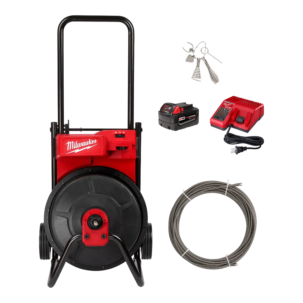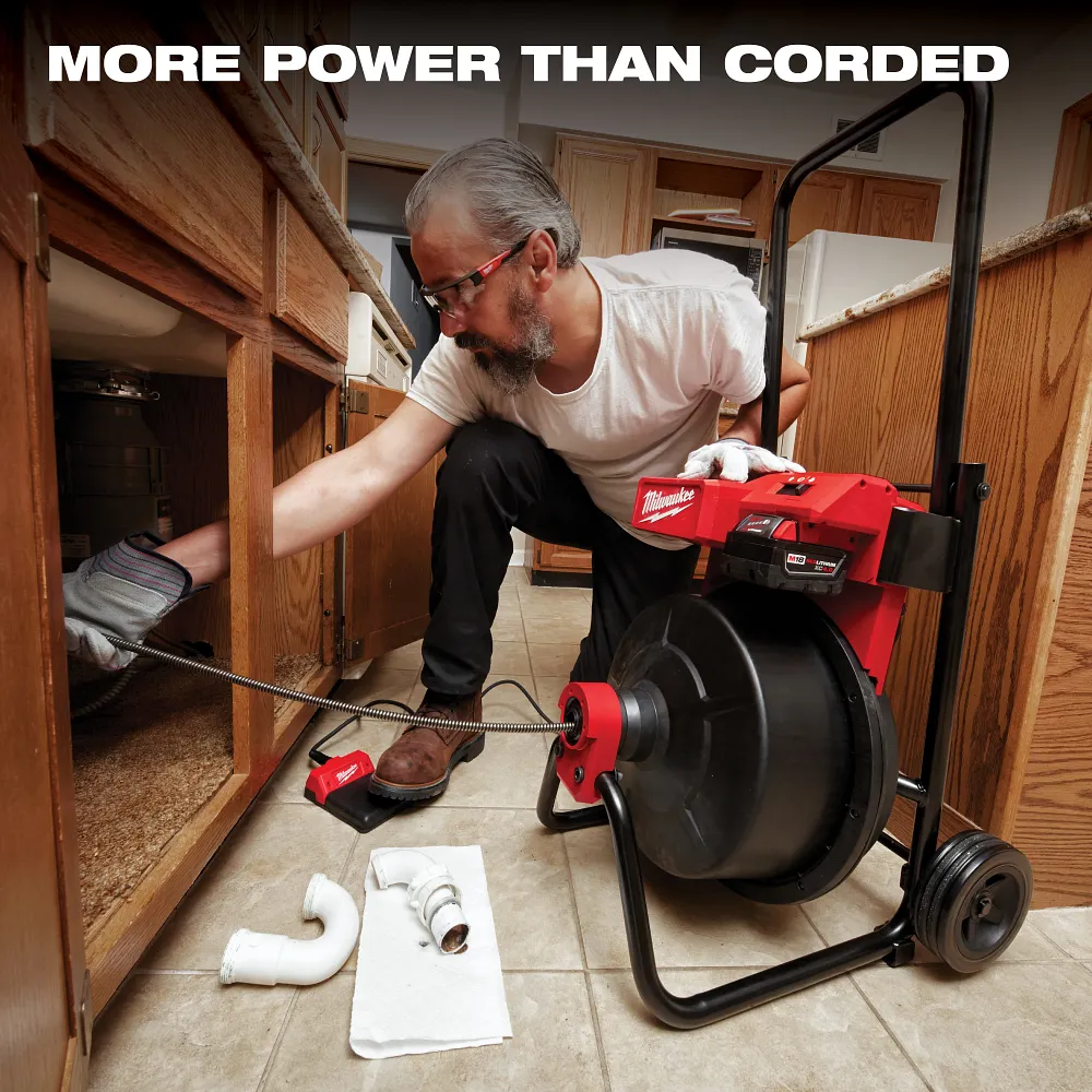 The MILWAUKEE® M18™ Drum Machine with a 3/8″ cable allows you to clean drains confidently with instant setup. This M18™ Drum Machine provides more power than corded machines to tackle tough blockages like grease, scale, and build-up. It can clear drains out to 100′ with a 3/8″ cable or 75′ with 1/2″ cable. The included 3/8″ cable is best for use in 1-1/2″- 3″ drain lines. For larger drain lines up to 4”, the machine is compatible with 1/2” cables. Complete multiple jobs on one battery charge while simultaneously eliminating the hassle of extension cords and finding electrical outlets, providing access to power anywhere. The enclosed drum and lightweight design allow for cleaner, easier transportation on and off the job. The Milwaukee M18™ Drum Machine is compatible with MILWAUKEE® CABLE DRIVE™ Assembly (47-53-2816) which gives you the capability to automatically feed and retract cable up to 15-20 feet per minute. Additional cable sizes and drum are available in 3/8″ x 100′ (48-53-2777) and 1/2″ x 75′ (48-53-2778), drum only (47-53-2817).