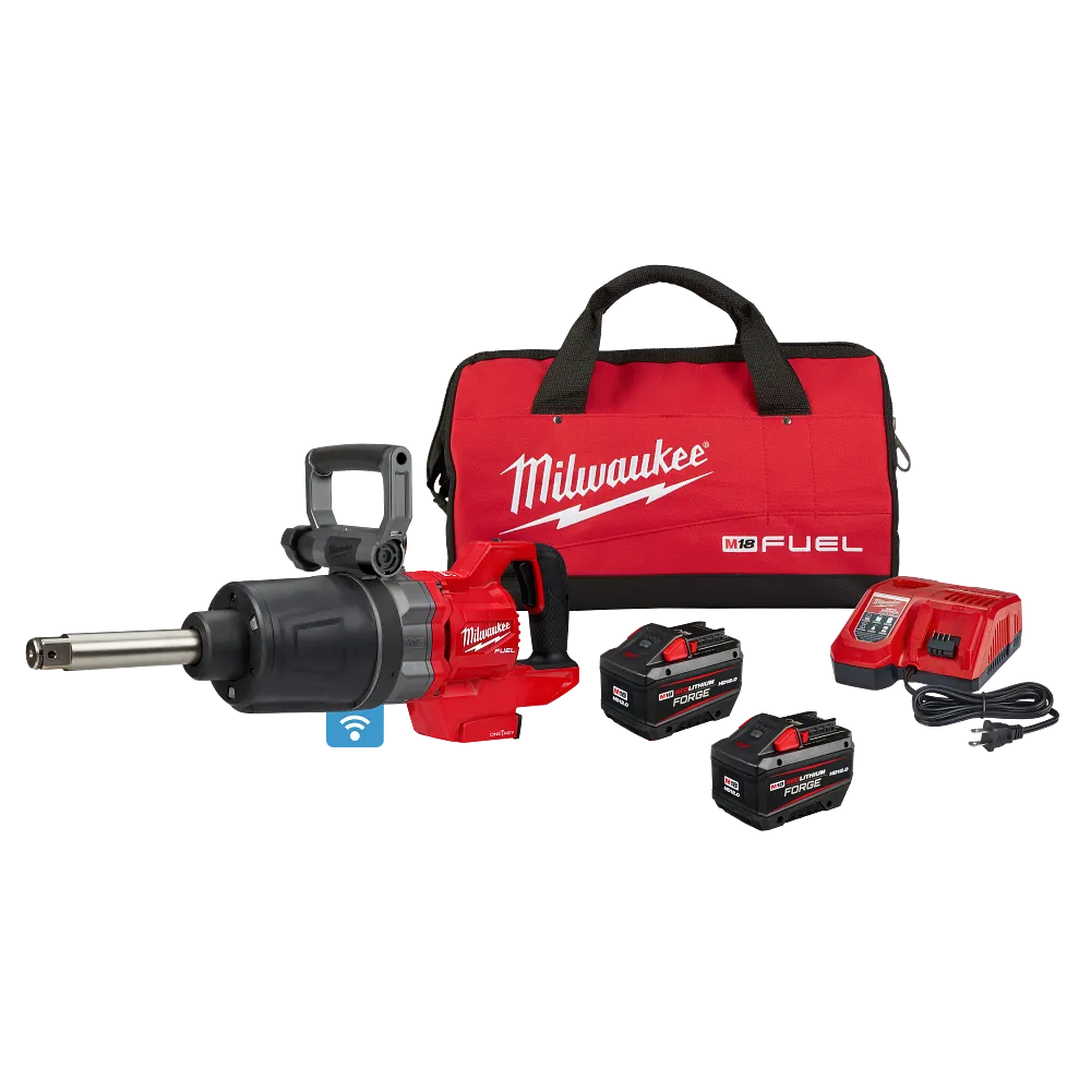 The MILWAUKEE® M18 FUEL™ 1″ D-Handle Extended Anvil High Torque Impact Wrench w/ ONE-KEY™ Kit is the world’s first cordless 1” D-Handle High Torque Impact Wrench. The POWERSTATE™ Brushless Motor delivers up to 2,000 ft-lbs of nut-busting torque and 1,900 ft-lbs of fastening torque, making this the world’s most powerful cordless impact wrench, enabling you to complete the most demanding applications. With the runtime for up to 120 lug nut removals and installations on a single battery, this portable impact wrench provides unmatched performance. The M18™ REDLITHIUM™ FORGE™ HD12.0 Battery Pack delivers 50% more power than the HIGH OUTPUT™ HD12.0 Battery, high-speed cooling for less downtime in high-demand applications, 35-minute supercharge to 80%, and the longest life vs REDLITHIUM™ batteries.The battery-powered impact wrench provides you with cordless convenience and eliminates the need for compressors, generators, cords, and hoses. With no compressor or hose, you have greater productivity and portability to complete applications not accessible with a pneumatic unit. Lug Nut Mode, which can be enabled through the ONE-KEY™ app, prevents the over-torque of lug nuts by automatically shutting off the tool, providing more control. The REDLINK PLUS™ Intelligence ensures you achieve maximum performance and protects the High Torque Impact Wrench against overloads, over-heating, and over-discharge. M18™ REDLITHIUM™ FORGE™ Battery Packs are compatible with all M18™ tools, providing this high torque cordless impact wrench with more work per charge and more work over the life of the pack. A patented battery isolation system manages high frequency vibrations, enabling battery movement that prevents damage and ensures a constant connection between the battery and tool when in use. The 4-Mode DRIVE CONTROL™ provides you with greater control over the output speed and power of the MILWAUKEE® High Torque Impact Wrench. The ONE-KEY™ Technology allows you to customize, track, and manage the impact wrench with the ability to set a repeatable torque output for maximum control.