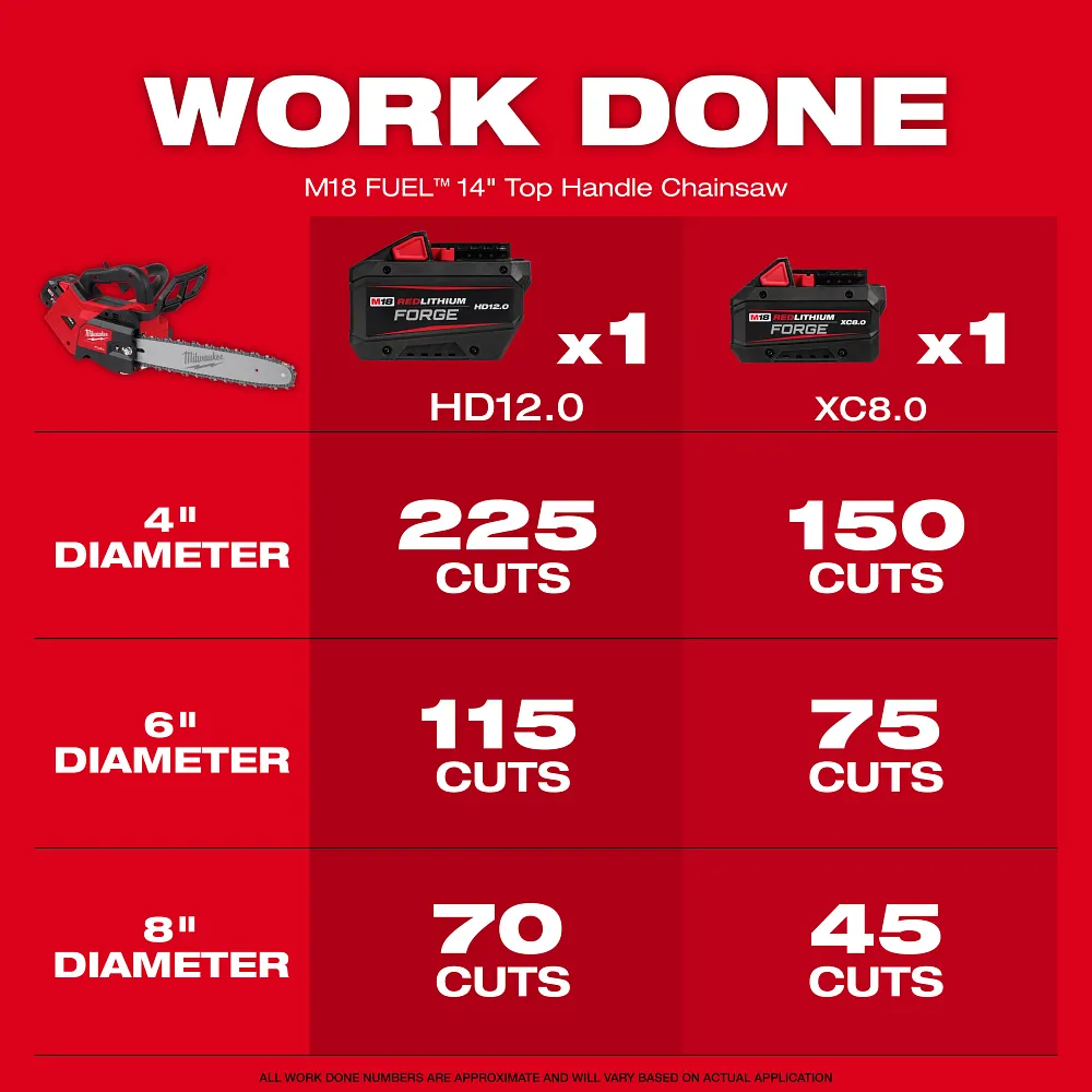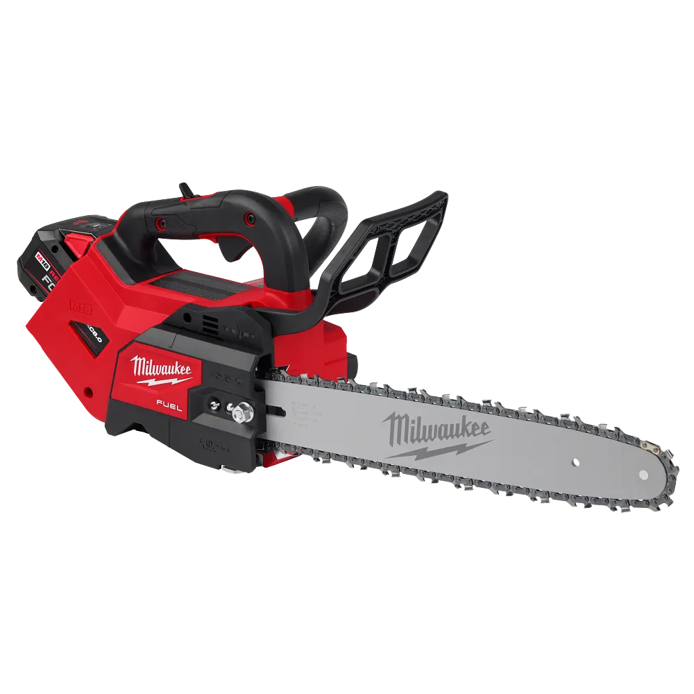 The Milwaukee® M18 FUEL™ 14″ Top Handle Chainsaw Kit cuts faster than 35cc gas, delivers the power to cut hardwoods, and eliminates the headaches associated with gas engines. The saw is designed to meet the performance, durability, and ergonomic needs of the professional arborist, power utility linemen, and landscape maintenance professional. M18 FUEL™ technology allows the saw to reach full throttle in under 1 second providing ultimate control and cut faster than 35cc gas for increased application speed. The POWERSTATE™ Brushless Motor maintains speed under heavy loads without bogging down to outperform small gas engines and higher voltage systems. In addition to outperforming gas competitors, the saw eliminates all of the headaches associated with gas engines, such as pull starts, noise levels, emissions, and regular maintenance. The REDLINK PLUS™ Intelligence enables full-circle communication between the tool and battery, providing you with unmatched levels of performance, protection, and productivity. The M18™ REDLITHIUM™ FORGE™ XC 8.0 Battery provides efficient power delivery giving you longer runtime in application with the ability to make 150 cuts per charge in 4″ x4″ Cedar. The saw has a professionally demanded feature set including an easy access chain tensioner, automatic oiler, metal bucking spikes, onboard scrench storage, lanyard loop, and climbing scabbard. The M18 FUEL™ 14″ Top Handle Chainsaw is fully compatible with 300+ solutions on the M18™ system.