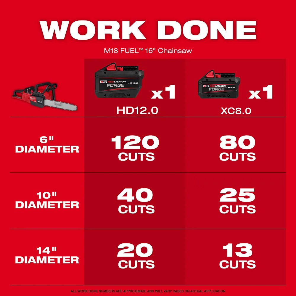The Milwaukee M18 FUEL™ 16 in. Chainsaw delivers the power to cut hardwoods, cuts faster than gas, and delivers up to 150 cuts per charge. The unit is designed to meet the performance, durability and ergonomic needs of professional landscape maintenance, power utility, and the installed M18 user. The POWERSTATE™ brushless motor maintains speed under heavy loads without bogging down to outperform small gas engines and higher voltage systems. REDLINK Plus™ intelligence ensures maximum performance and protection from overload, overheating and over discharge. When paired with the M18™ REDLITHIUM™ HIGH OUTPUT™ HD12.0 battery (sold separately), the unit delivers unmatched run-time in all applications. M18 FUEL™ technology allows the unit to reach full throttle in under 1 second providing ultimate control and productivity.