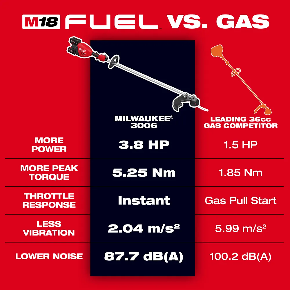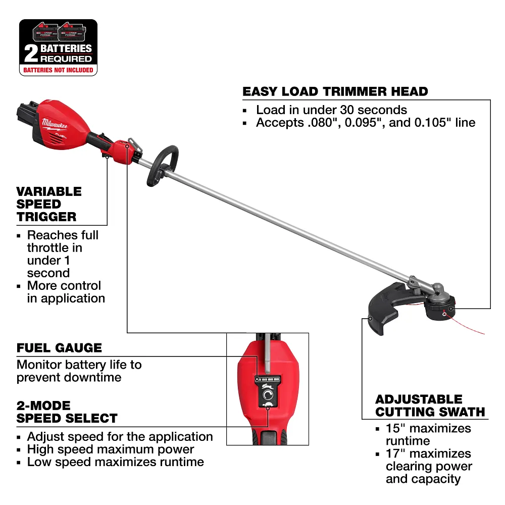 The MILWAUKEE® M18 FUEL™ 17″ Dual Battery String Trimmer meets the performance, durability, and ergonomic needs of landscape maintenance professionals. This string trimmer provides the Highest Power, delivering the most peak torque compared to leading professional gas and battery string trimmers. This string trimmer provides users with the Fastest Clearing, cutting through the most demanding applications while maintaining the highest string speed. The POWERSTATE™ Brushless Motor and advanced electronic package allow the string trimmer to reach Full Throttle in Under 1 Second, boosting control and productivity. The REDLINK PLUS™ Intelligence enables full-circle communication between the tool and battery, providing you with unmatched levels of performance, protection, and productivity. The advanced electronic package also delivers high and low speeds, and a variable speed trigger giving you ultimate control over the power range. The string trimmer requires (2) M18™ REDLITHIUM™ Batteries for operation and is optimized to be used with M18™ REDLITHIUM™ HIGH OUTPUT™ batteries. The M18™ REDLITHIUM™ HIGH OUTPUT™ XC8.0 Battery gives you best-in-class performance and run-time in all applications. The Easy Load Trimmer Head provides an easy line loading experience and the ability to load up to 25′ of trimmer line in under 30 seconds. The M18 FUEL™ 17″ Dual Battery String Trimmer is fully compatible with 250+ solutions on the M18™ system.